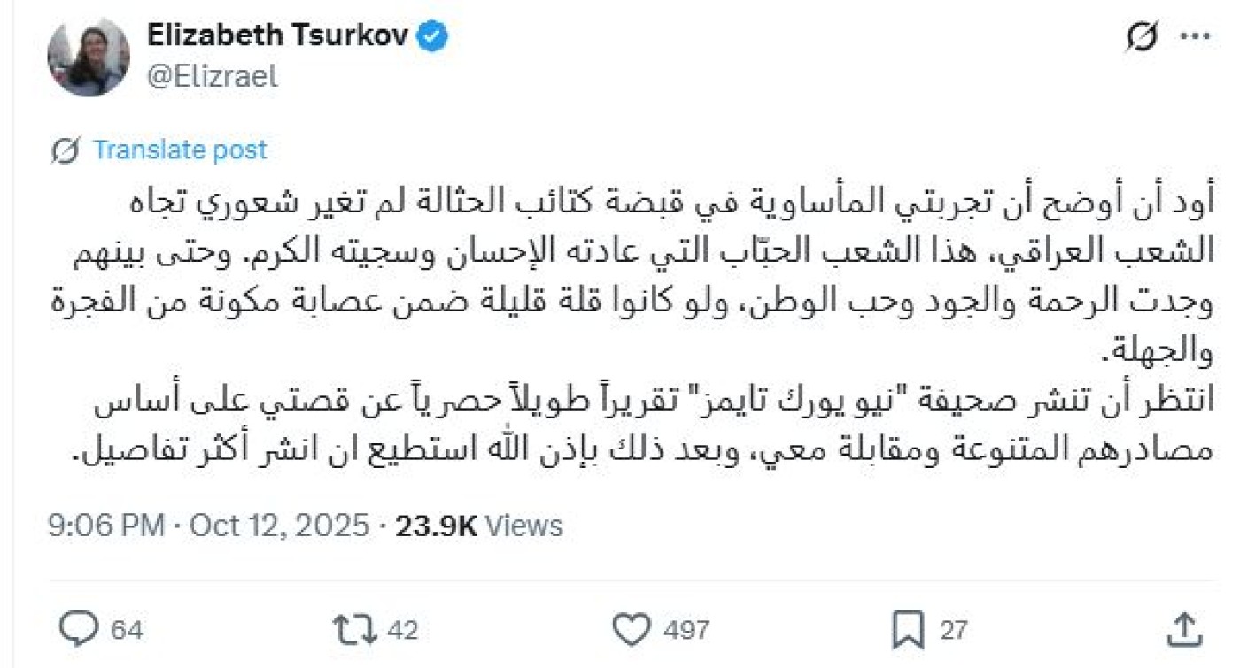 قالت الباحثة الروسية – الإسرائيلية أليزابيث تسوركوف، الأحد 12 تشرين الأول 2025، إن "تجربتها المأساوية" (في إشارة إلى فترة اختطافها في العراق)، لم تغيّر شعورها تجاه الشعب العراقي، واصفة الأخير بـ"الرحمة والجود والكرم".