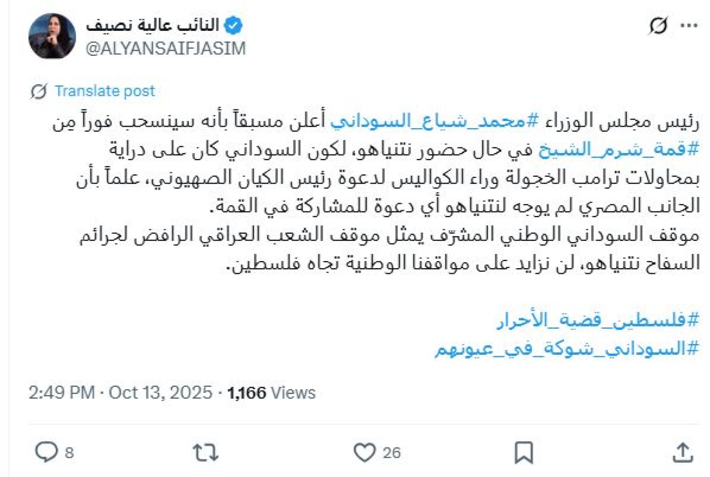 وقالت نصيف في تدوينة تابعتها "الجبال"، إن "رئيس مجلس الوزراء محمد شياع السوداني أعلن مسبقاً بأنه سينسحب فوراً مِن قمة شرم الشيخ في حال حضور نتنياهو، لكون السوداني كان على دراية بمحاولات ترامب الخجولة وراء الكواليس لدعوة رئيس الكيان الصهيوني، علماً بأن الجانب المصري لم يوجّه لنتنياهو أي دعوة للمشاركة في القمة".