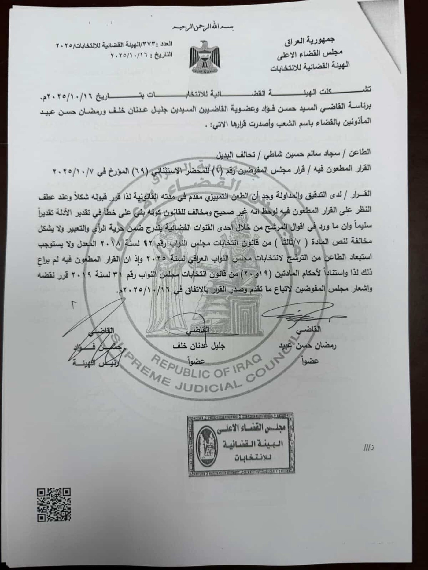 وأضاف أنه "وإذ ان القرار المطعون فيه لم يراع ذلك، واستناداً لأحكام المادتين 19 و20 من قانون انتخابات مجلس النواب رقم 31 لسنة 2019 قرر نقضه وإشعار مجلس المفوضين لاتباع ما تقدم"، مشيراً أنه "صدر القرار بالاتفاق".