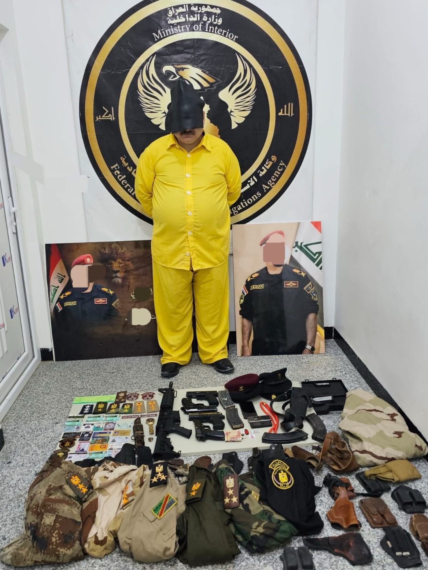 أعلنت وزارة الداخلية، الخميس 16 تشرين الأول 2025، القبض على منتحل صفة ضابط برتبة لواء في كربلاء، بحوزته أسلحة وباجات وبدلات عسكرية.