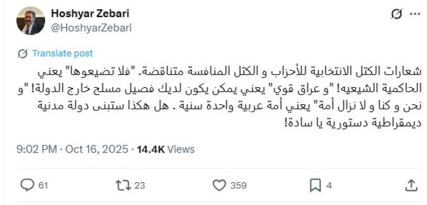 وقال زيباري في تدوينة تابعتها "الجبال"، إن "شعارات الكتل الانتخابية للأحزاب والكتل المتنافسة، متناقضة، فـ(فلا تضيعوها) يعني الحاكمية الشيعيه، و(عراق قوي) يعني يمكن يكون لديك فصيل مسلح خارج الدولة، و(نحن كنا ولا نزال أمة) يعني أمة عربية واحدة سنية".