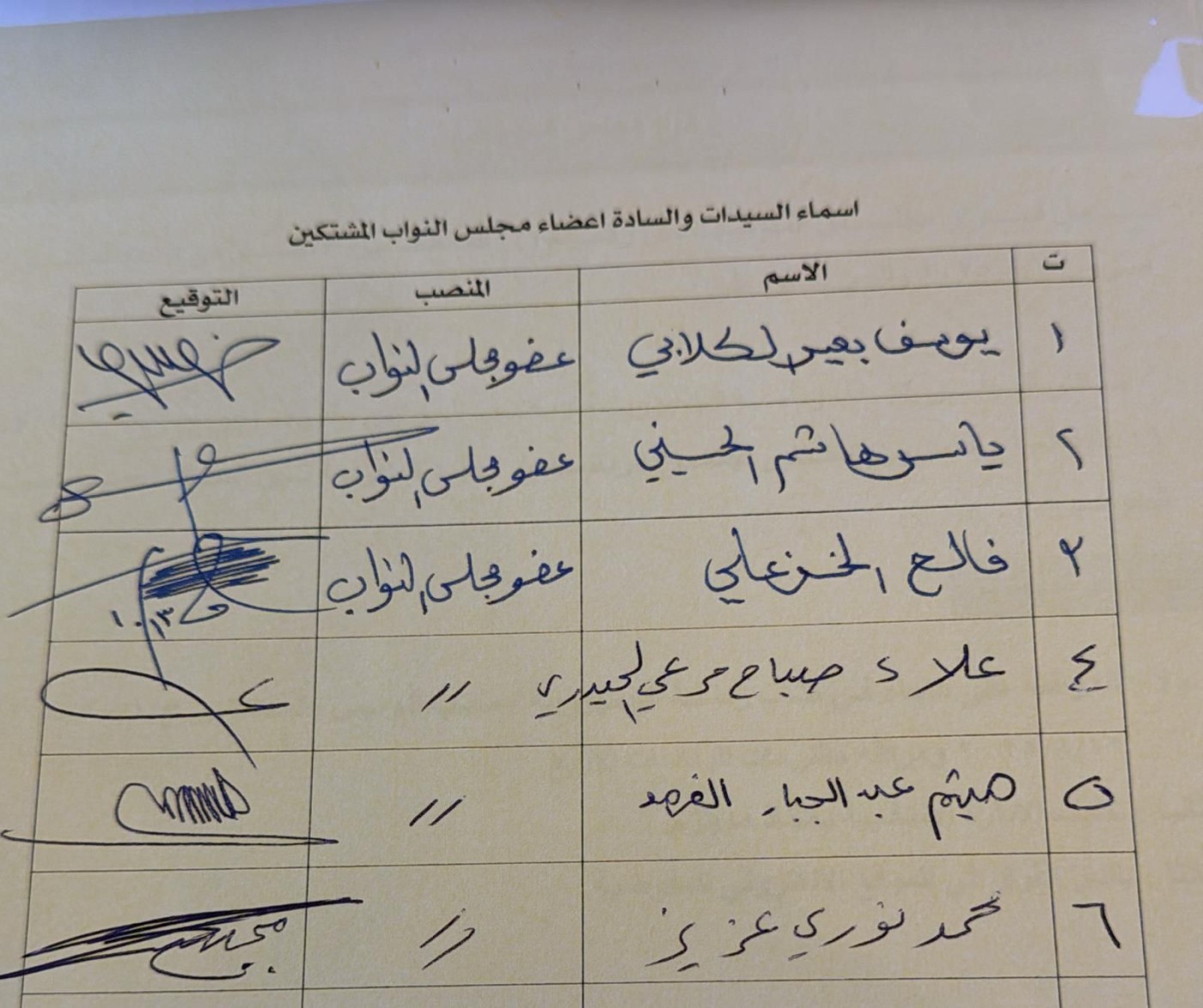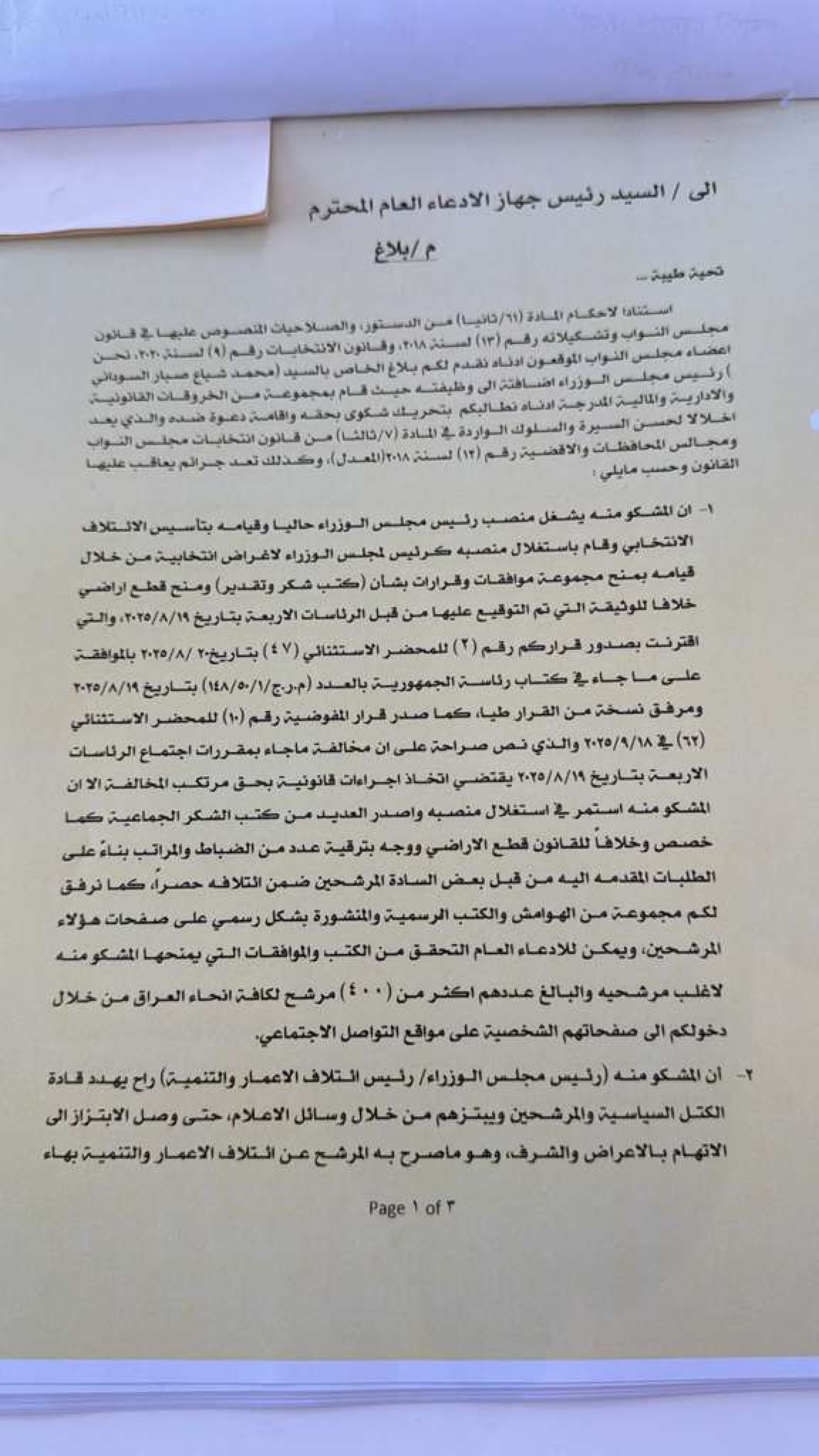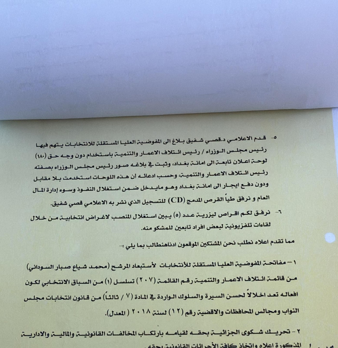 وبحسب الوثيقة تقدّم النواب (يوسف بعير الكلابي، وياسر هاشم الحسيني، وفالح الخزعلي، وعلاء صباح الحيدري، وهيثم عبد الجبار الفهد، ومحمد نوري عزيز) بالشكوى ضد السوداني إلى الادعاء العام يوم الخميس الماضي الموافق 16 تشرين الأول.