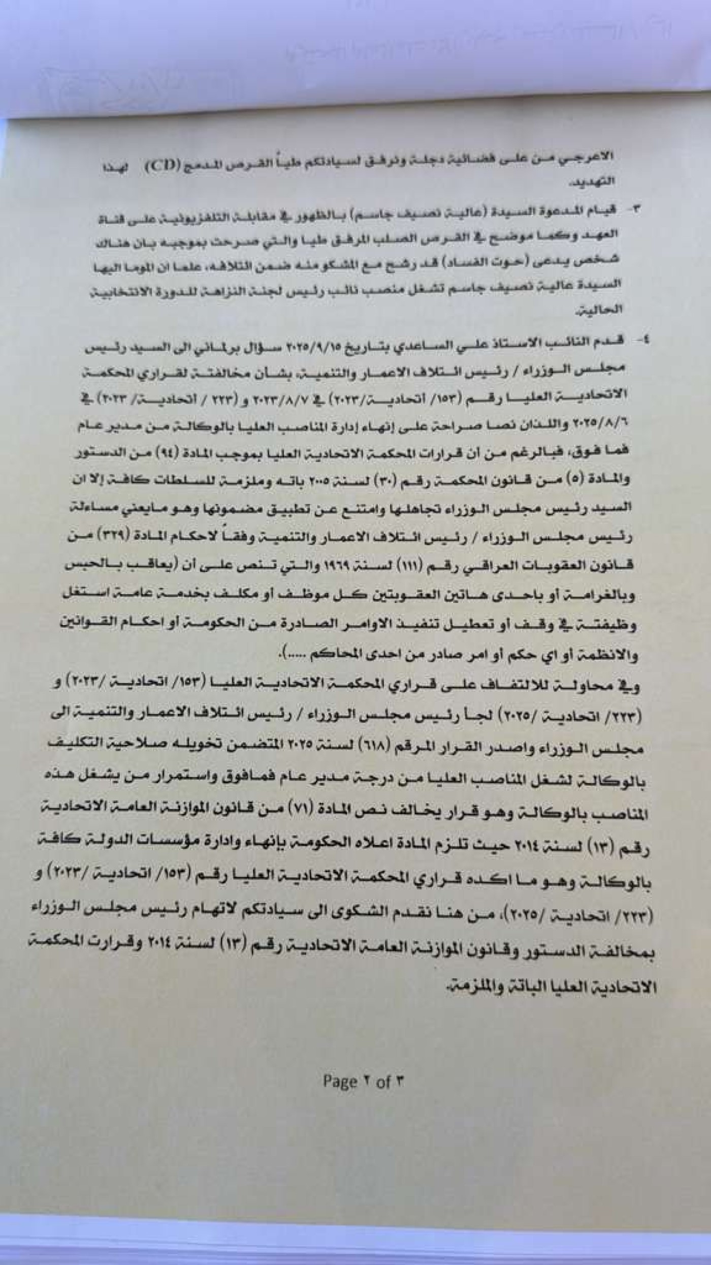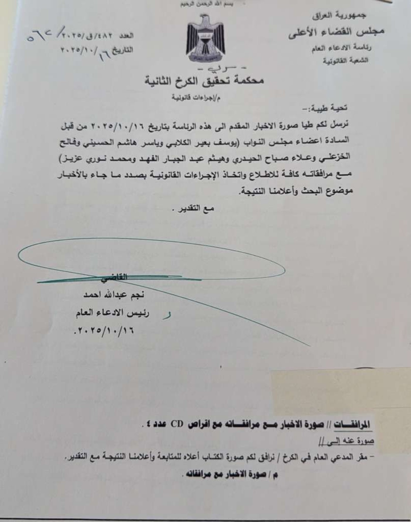 وكشفت وثيقة سرّية نشرت اليوم الأحد 19 تشرين الأول 2025، قيام رئيس الادعاء العام نجم عبدالله أحمد الشكوى إلى محكمة تحقيق الكرخ الثانية عن عدد من المخالفات القانونية، مطالباً باتخاذ الإجراءات القانونية بهذا الصدد.