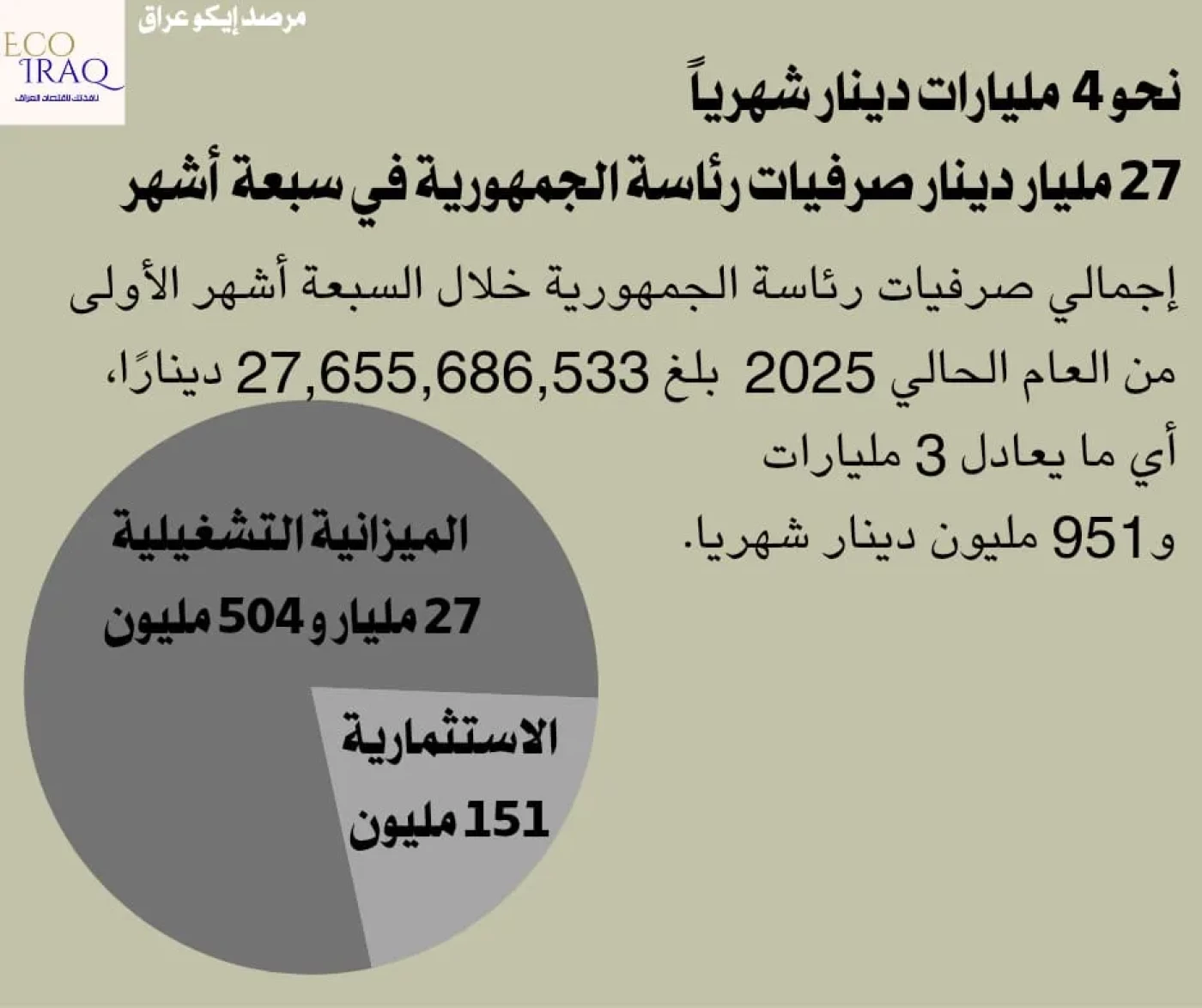 كشف مرصد "إيكو عراق"، أن الصرفيات الفعلية لرئاسة الجمهورية بلغت قرابة 4 مليارات دينار شهرياً "دون وجود أي نشاط تشريعي بارز".