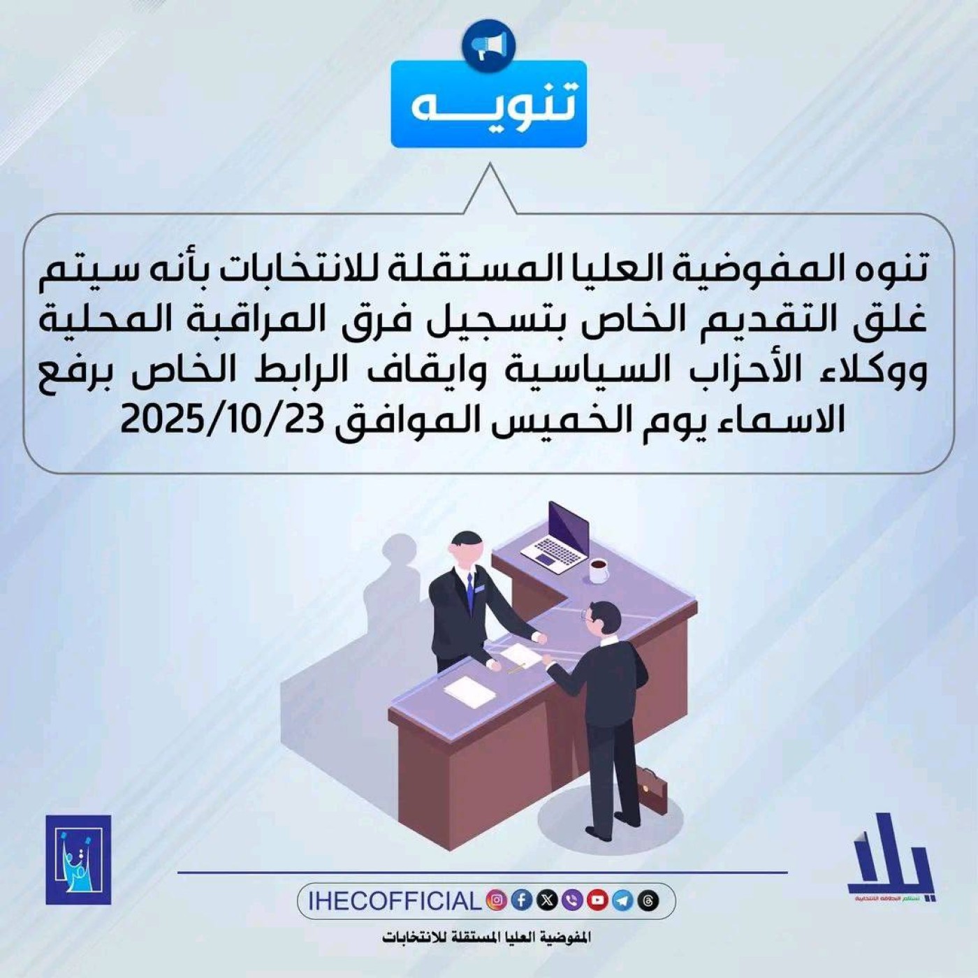 ووفق بيان صادر عن المفوضية وتلقت "الجبال"، نسخة منه، فإنه "تنوه المفوضية العليا المستقلة للانتخابات بأنه سيتم غلق التقديم الخاص بتسجيل فرق المراقبة المحلية ووكلاء الأحزاب السياسية وإيقاف الرابط الخاص برفع الأسماء يوم الخميس الموافق 2025/10/23".