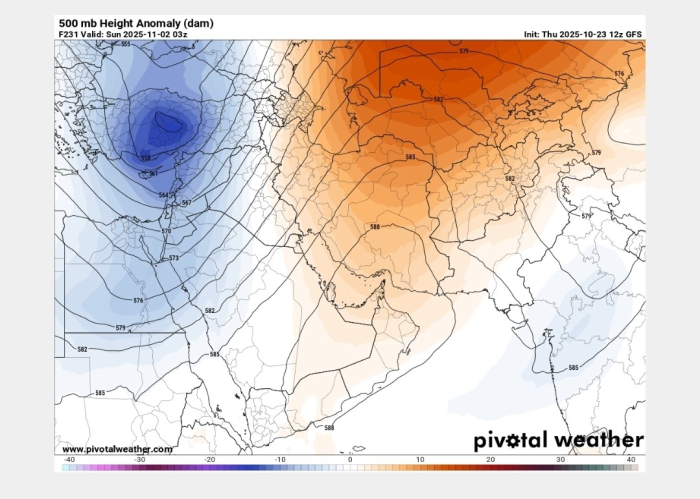 وأضافت، أن "التدرج القوي لخطوط الكونتور المبينة في الصورة أدناه بين الحوض البارد والمرتفع الدافئ يولد تياراً نفاثاً، وانسيابية عليا للرياح نشطة على الحافة الشرقية للحوض، ومن المهم التركيز على أنه عند الحافة الشرقية للحوض العلوي، يحصل عادة انفصال وفراغ ديناميكي يؤدي إلى تصعيد هواء من الأسفل (وجود قوة رفع)، إذا توفرت الرطوبة، وبالتالي يخلق أجواء مناسبة. لتشكل سحب ممطرة في هذا التموضع، خصوصاً إذا تواجد منخفض سطحي".