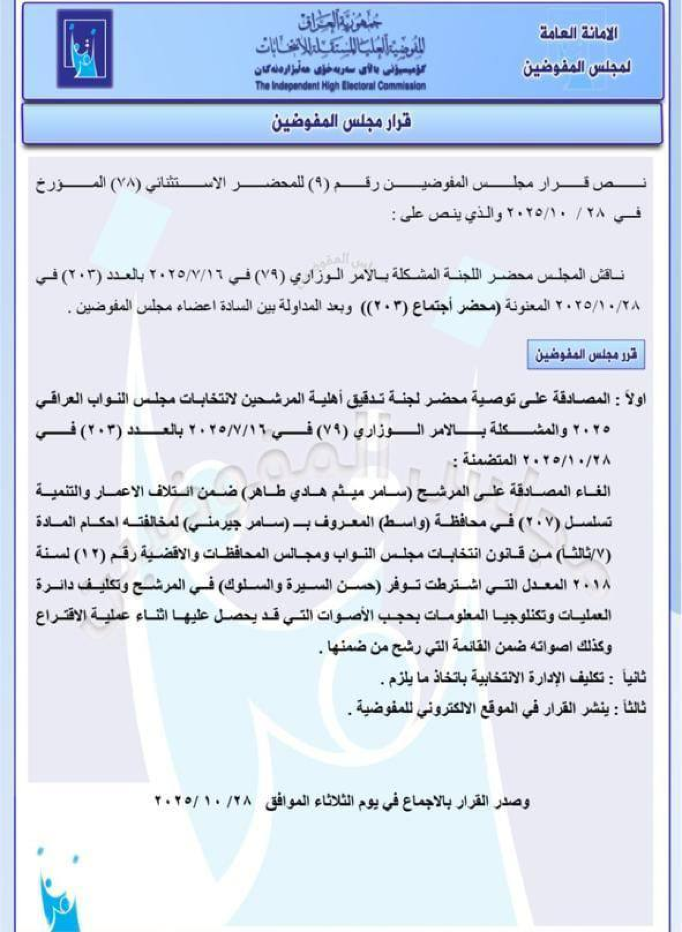 وبحسب الوثيقة، تم "إلغاء المصادقة على المرشح سامر ميثم هادي طاهر من ائتلاف الإعمار والتنمية تسلسل 207 في محافظة واسط المعروف بسامر جيرمني لمخالفته أحاكم المادة 7 ثالثاً من قانون انتخابات مجلس النواب... التي اشترطت توفر حسن السيرة والسلوك في المرشح".