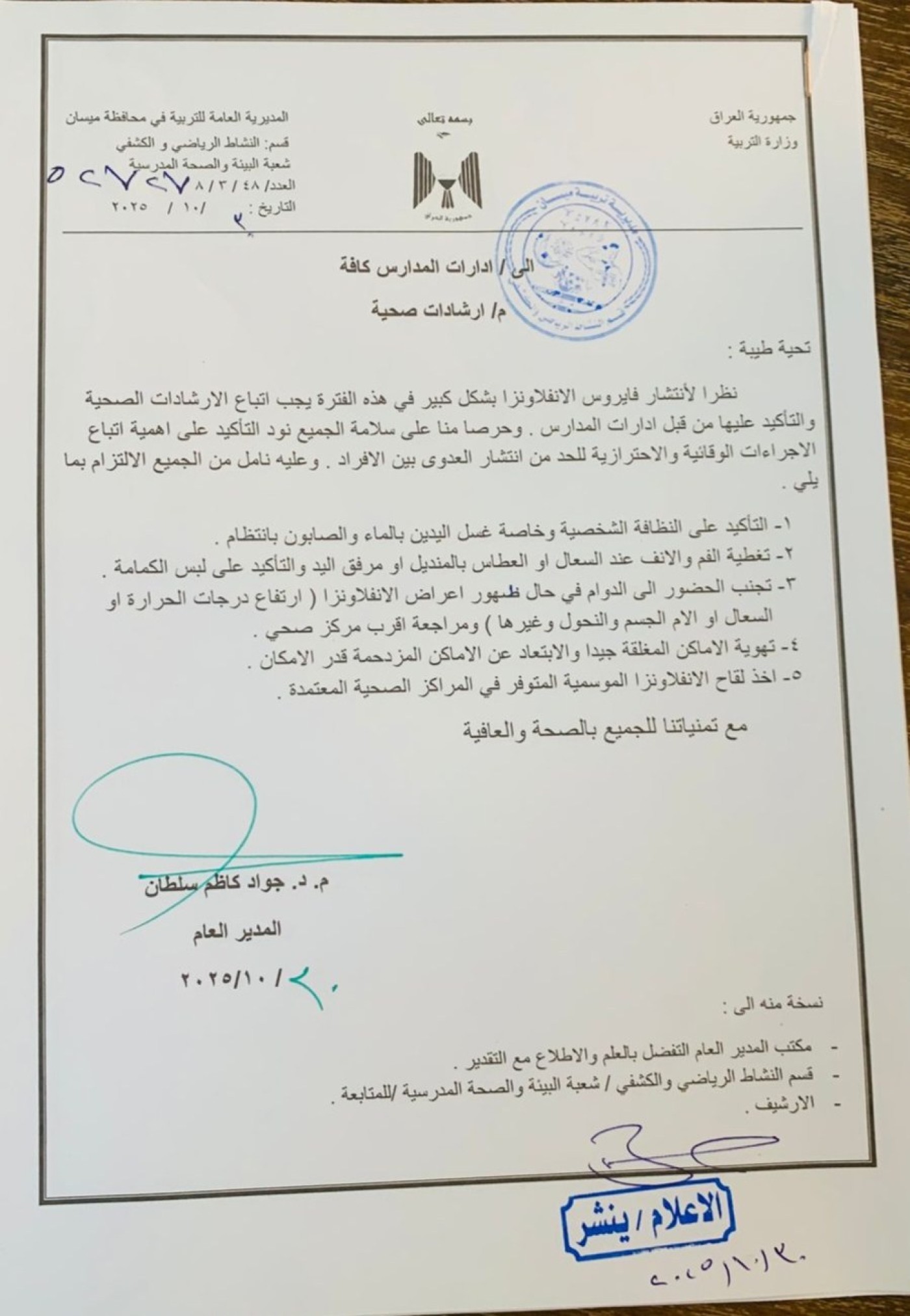 أصدرت مديرية تربية محافظة ميسان، الخميس 30 تشرين الأول 2025، حزمة توصيات لإدارات المدارس، في إطار مواجهة انتشار الإنفلونزا.