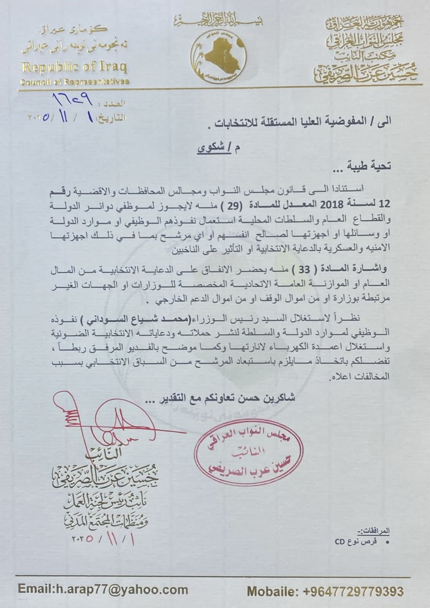 وجاء في شكوى رسمية موجّهة من مكتب عرب إلى المفوضية، بتاريخ أمس السبت الأول من تشرين الثاني 2025، أنه "استناداً الى قانون مجلس النواب ومجالس المحافظات والاقضية رقم 12 لسنة 2018 المعدل للمادة (29) منه، لا يجوز لموظفي دوائر الدولة والقطاع العام والسلطات المحلية استعمال نفوذهم الوظيفي أو موارد الدولة أو وسائلها أو أجهزتها لصالح انفسهم أو أي مرشح، بما في ذلك أجهزتها الأمنية والعسكرية بالدعاية الانتخابية أو التأثير على الناخبين، وإشارة المادة (33) منه يحضر الانفاق على الدعاية الانتخابية من المال العام أو الموازنة العامة الاتحادية المخصصة للوزارات أو الجهات الغير مرتبطة بوزارة أو من أموال الوقف أو من أموال الدعم الخارجي".