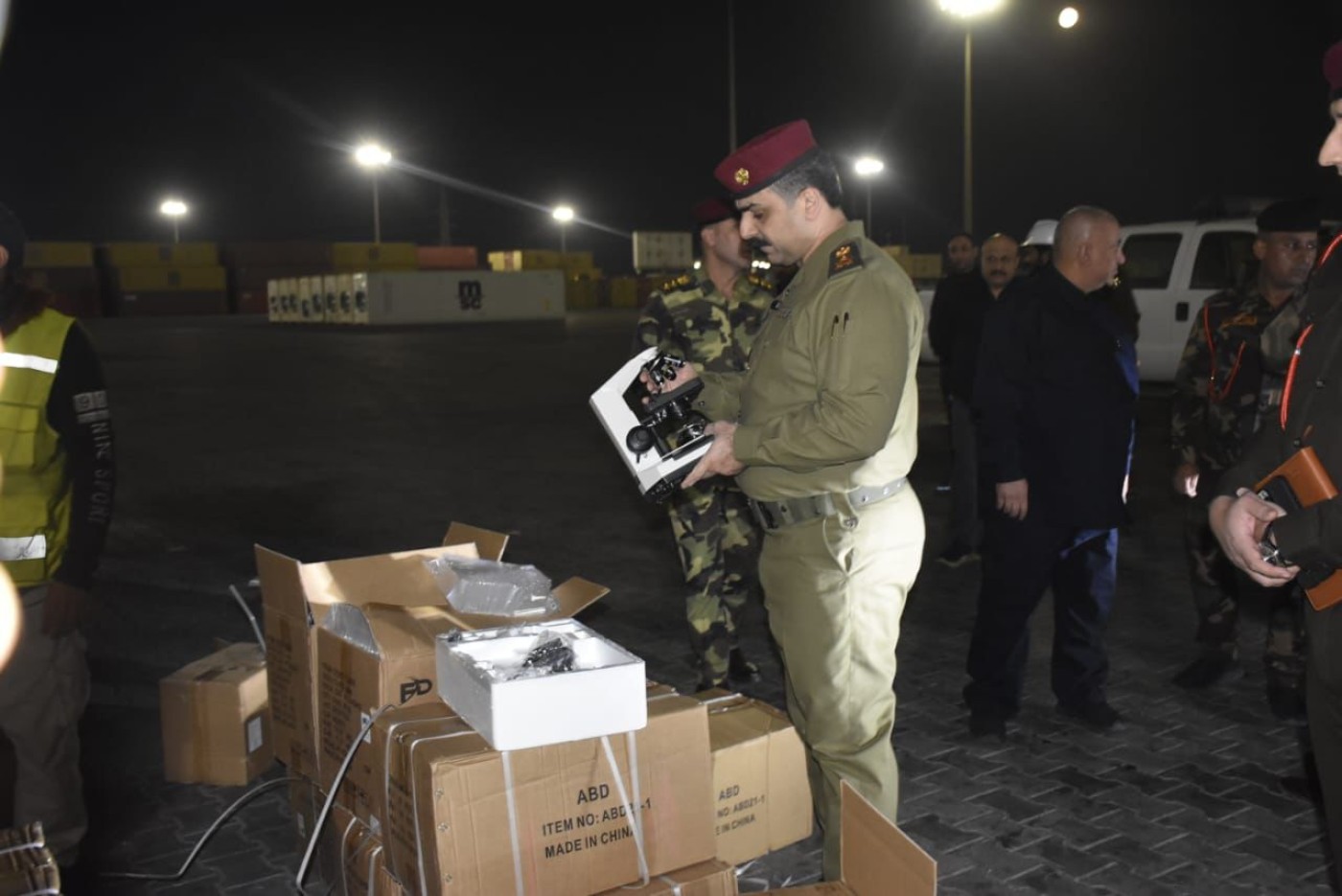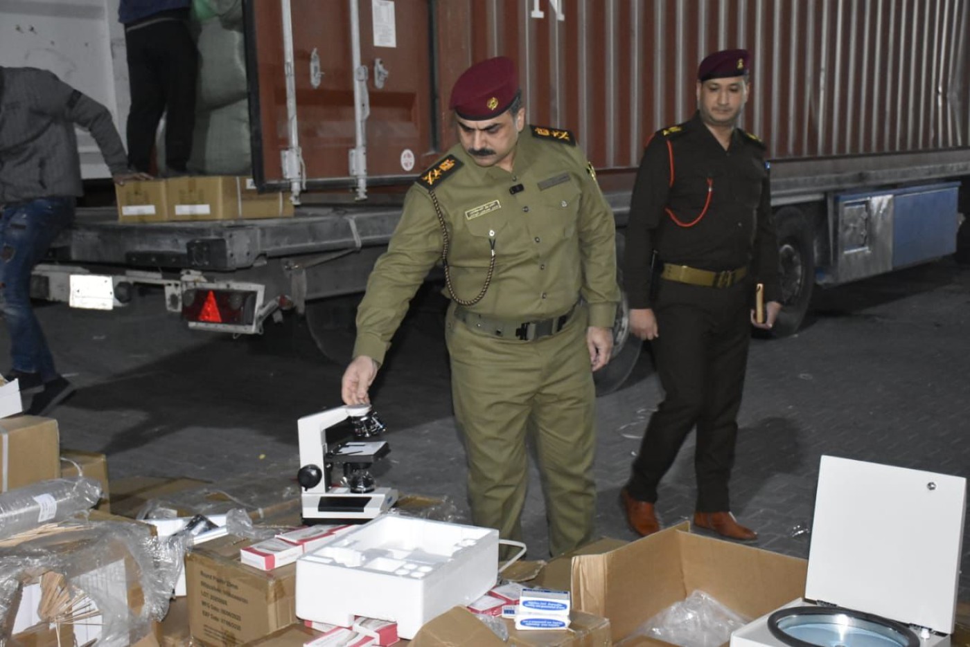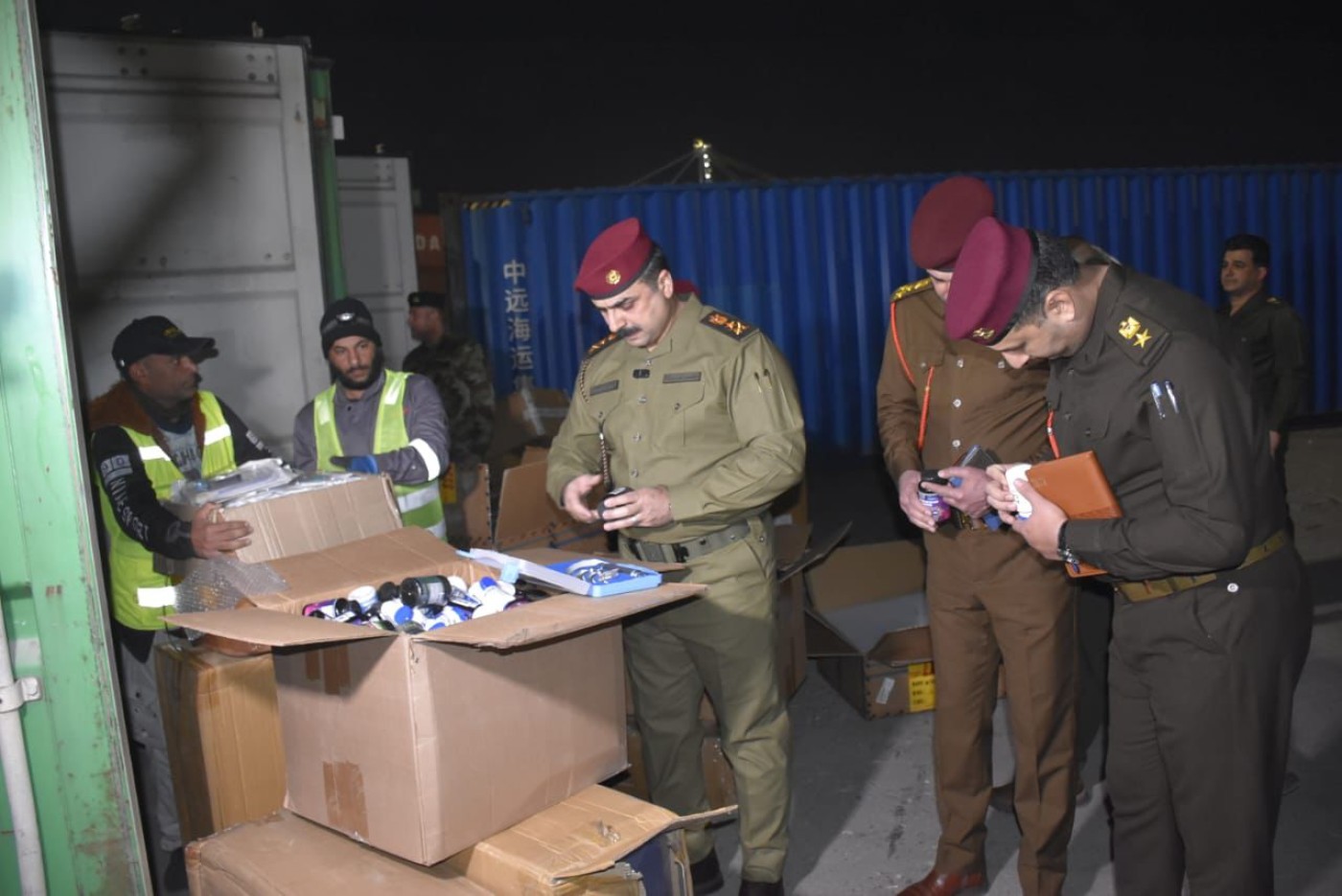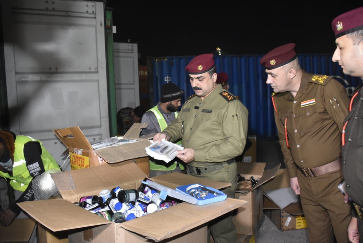وذكرت الهيئة في بيان، أنه "استناداً لمعلومات دقيقة من رئيس هيئة المنافذ الحدودية الفريق عمر عدنان الوائلي، تم ضبط 13 حاوية في منفذ ميناء ام قصر الشمالي، سبع حاويات منها تحتوي على أدوية بشرية، وخمس حاويات آخرى فيها مستلزمات طبية وأجهزة مختبرات طبية وأجهزة ليزر وأجهزة إذابة شحوم، مخالفة لشروط وضوابط الاستيراد، مخبأة خلف بملابس ومواد منزلية معده للتهريب ودفع الرسوم، بدون موافقات من وزارة الصحة وحاوية مفرقعات ممنوعة من الاستيراد".