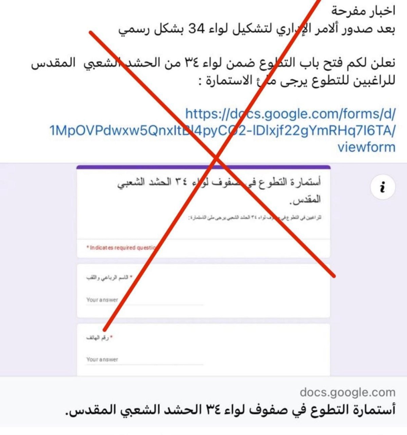 نفت هيئة الحشد الشعبي فتح باب التطوع أمام الراغبين للانضمام إلى صفوفها، مشيرة أن ما يتداول عن فتح الباب في اللواء "34"، "كاذبة" و"مزيفة".