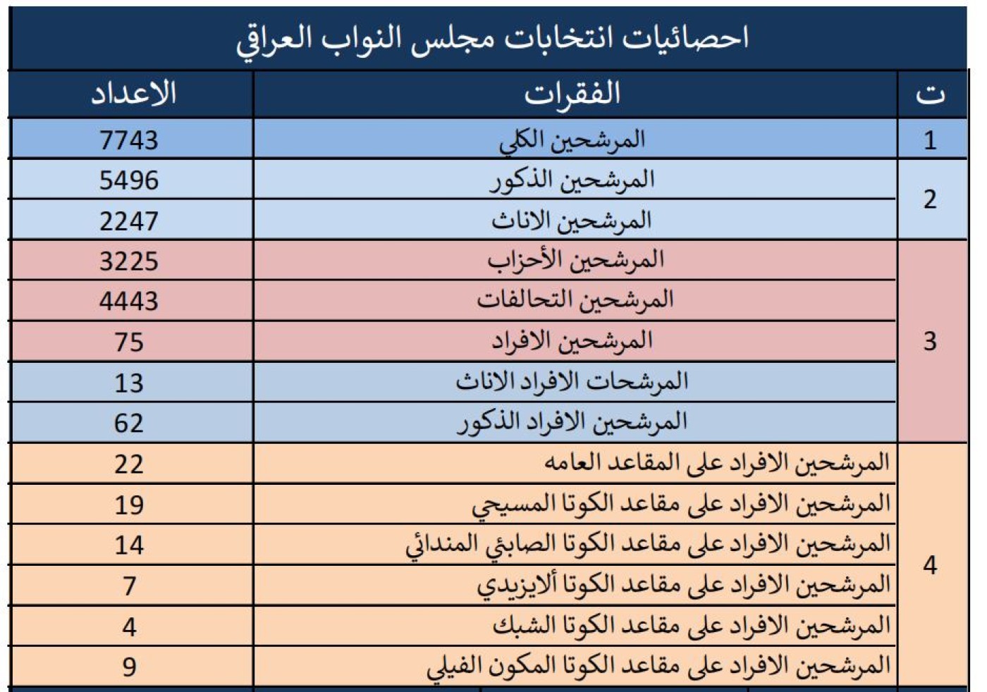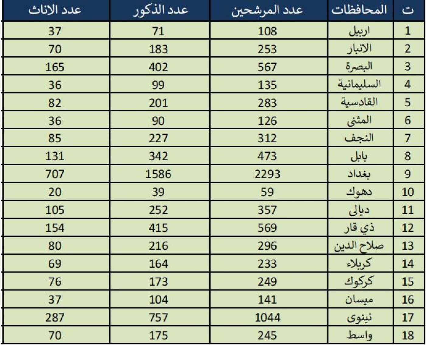 وبحسب الوثئق، فإن "محافظة بغداد تصدرت قائمة عدد المرشحين في عموم العراق، بواقع 2293 مرشحاً، تليها محافظة نينوى بواقع 1004 مرشحين".