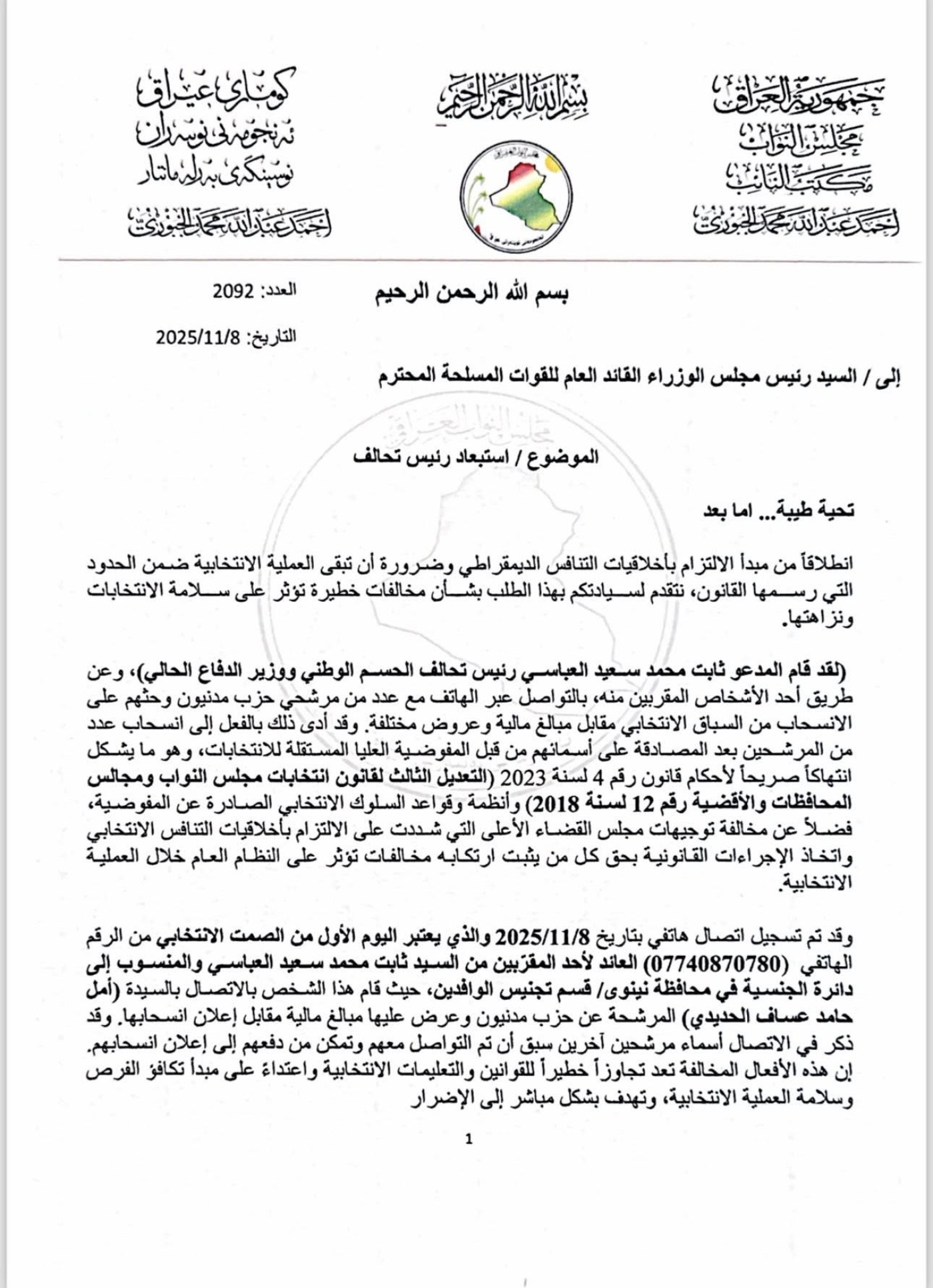 وبحسب وثيقة رسمية صادرة عن مكتب الجبوري إلى مكتب رئيس مجلس الوزراء والقائد العام للقوات المسلحة محمد شياع السوداني، بتاريخ 8 تشرين الثاني 2025، ونشرت اليوم الأحد 9 تشرين الثاني 2025، فإن العباسي دفع خمس مرشحين (بعد مصادقة المفوضية على ترشيحهم) للانسحاب من الانتخابات مقابل مبالغ مالية قدمها لهم.