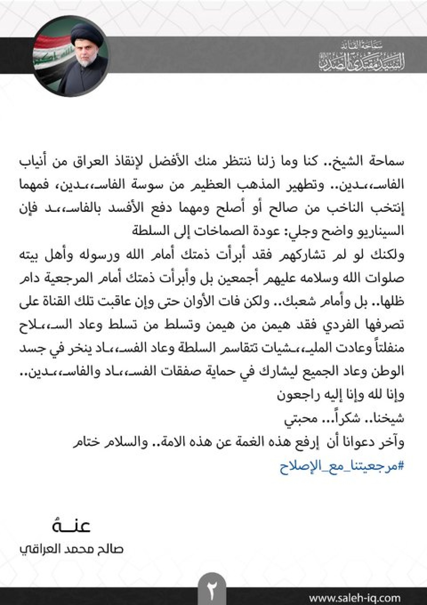 وقال الصدر: "سماحة الشيخ، لو انتخب أتباعك الصالح وتركوا الفاسد، فهل يعني ذلك تشكيل حكومة صالحة؟ هل نسيت نفوذ الدولة العميقة الفاسدة وتسلطها على مفاصل الانتخابات؟"، مضيفاً أن "فوز الصالح في ظل تلك الهيمنة أمر مستبعد".