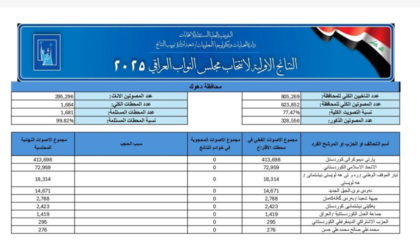 أعلنت المفوضية العليا للانتخابات، الأربعاء 12 تشرين الثاني 2025، نتائج الانتخابات البرلمانية التي أُجريت مؤخراً في العراق، وتحديداً في محافظة دهوك.