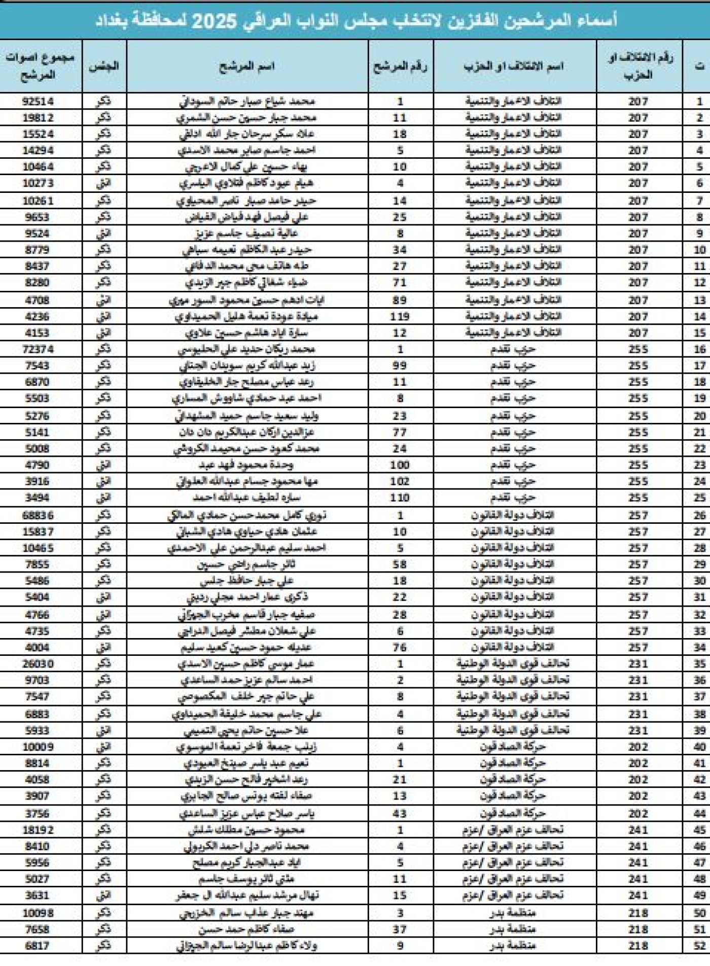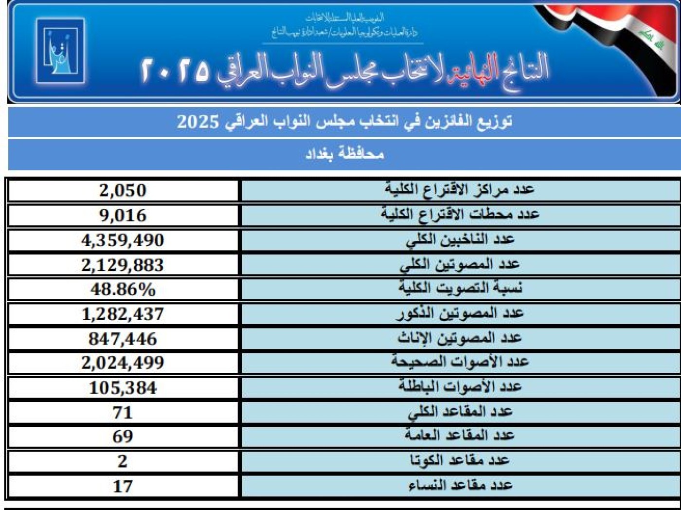 حصد ائتلاف "الإعمار والتنمية" على 15 مقعداً في محافظة بغداد، في نتائج الانتخابات النهائية لمجلس النواب العراقي 2025، التي أعلنت عنها مفوضية الانتخابات، الاثنين 17 تشرين الثاني 2025، فيما جاء حزب "تقدم" في المرتبة الثانية بواقع 10 مقاعد، تلاه ائتلاف "دولة القانون" بواقع 9 مقاعد.