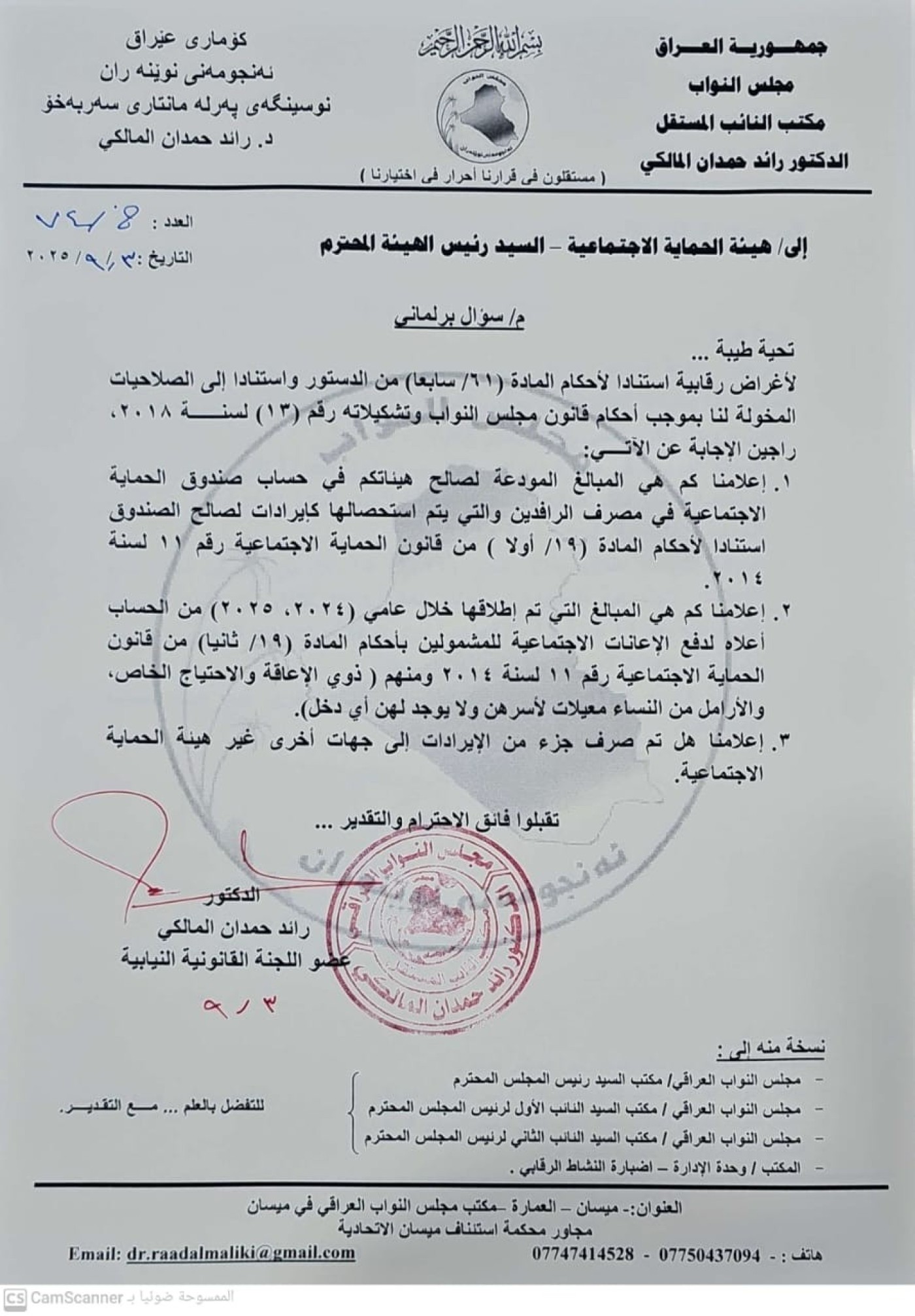 وأشار إلى أنه "سؤال برلماني قدم من عضو اللجنة القانونية الدكتور رائد المالكي تمت به مفاتحة 3 ثلاث جهات من بينها هيئة الحماية الاجتماعية عن أموال الصندوق وهل تم صرفها لغير الغرض المخصصة لأجله؟".