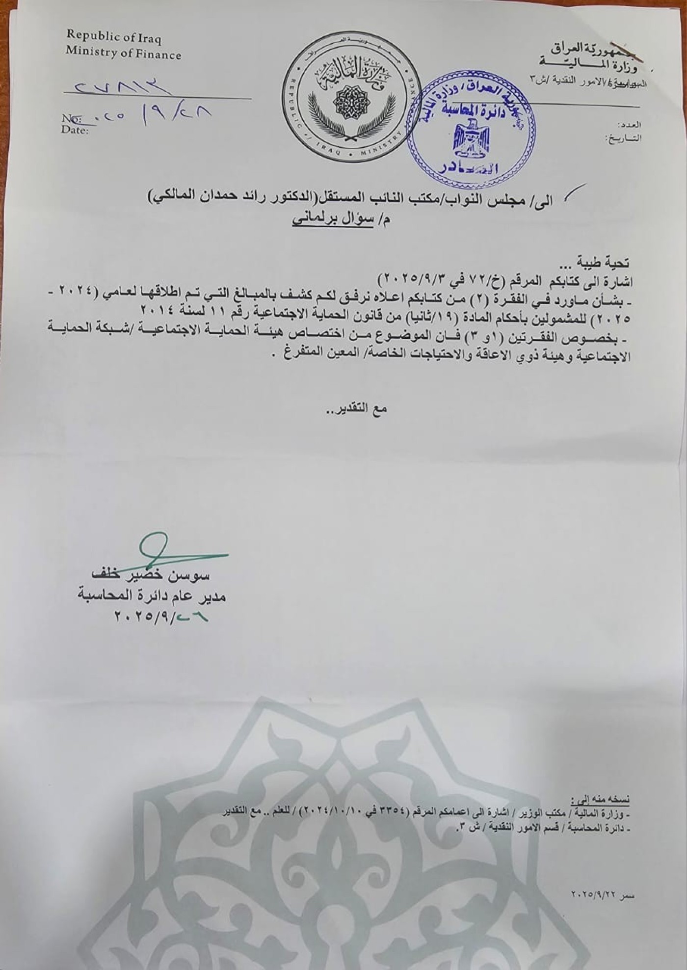 وأشار إلى أنه "وقد وصلت إجابة وزارة المالية عن بعض أجزاء هذا السؤال وأحالت الإجابة بشأن الفقرة (3) منه إلى هيئة الحماية الاجتماعية والتي لم تصلنا إجابتها بعد، ويبدو أنها لجأت إلى إقامة الشكوى بعد ورود السؤال البرلماني".
