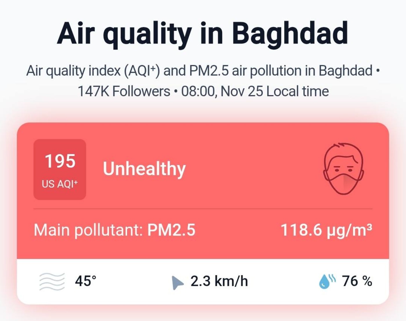ووفق تدوينة لعطية وتابعتها "الجبال"، فإن "جودة الهواء في العاصمة بغداد يُسجّل اللون البنفسجي، في دلالةٍ واضحة على تردّي الظروف البيئية وارتفاع مستويات الملوّثات في الجو، نتيجة لسكون الهواء وأنتشار المعامل غير المنظمة المخالفة للبيئة، وعمليات حرق النفايات العشوائية".