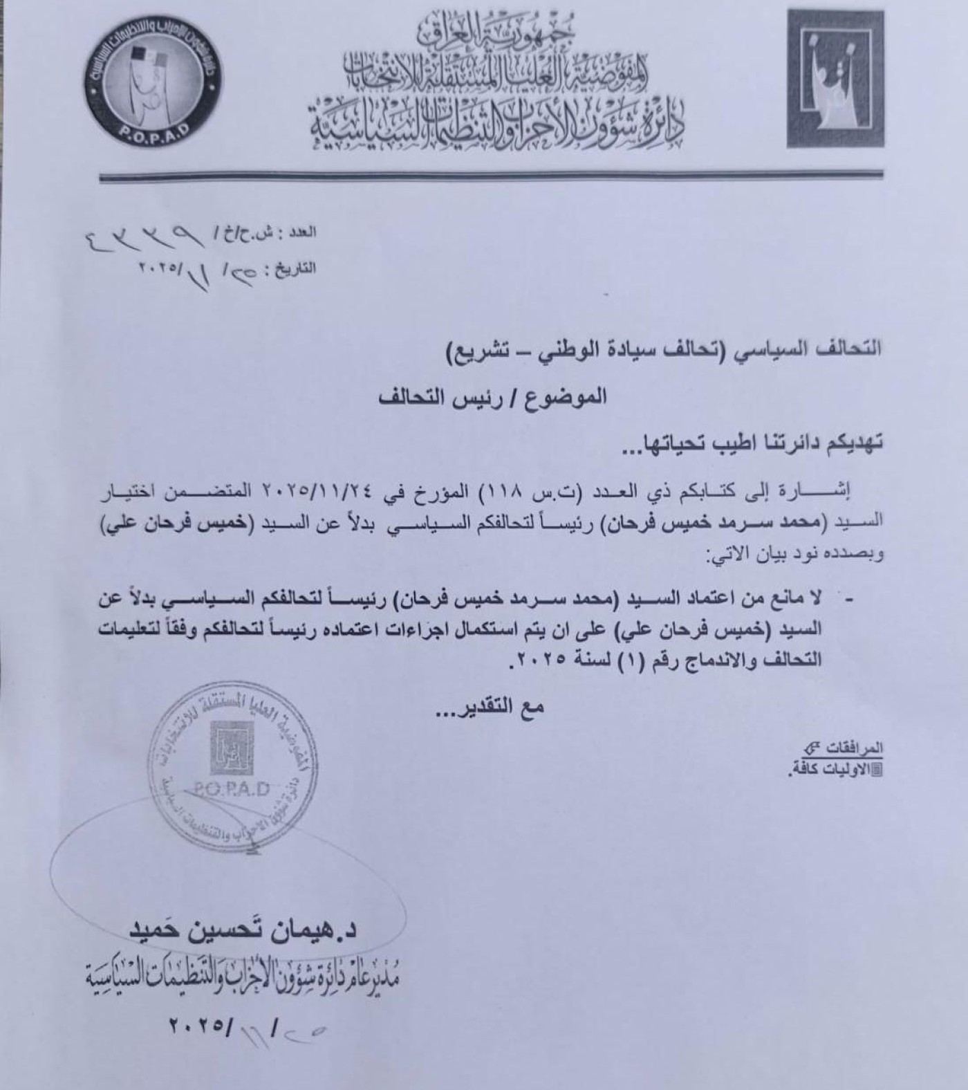 وبحسب وثيقة صادرة الثلاثاء 25 تشرين الثاني 2025، من دائرة شؤون الأحزاب التنظيمية والسياسية، وحصلت عليها "الجبال"، فإنه يكلف "سرمد خميس فرحان رئيساً لتحالفكم السياسي بدلاً عن خميس فرحان علي على أن يتم استكمال إجراءات اعتماده رئيساً لتحالفكم وفقاً لتعليمات التحالف والاندماج رقم 1 لسنة 2025".
