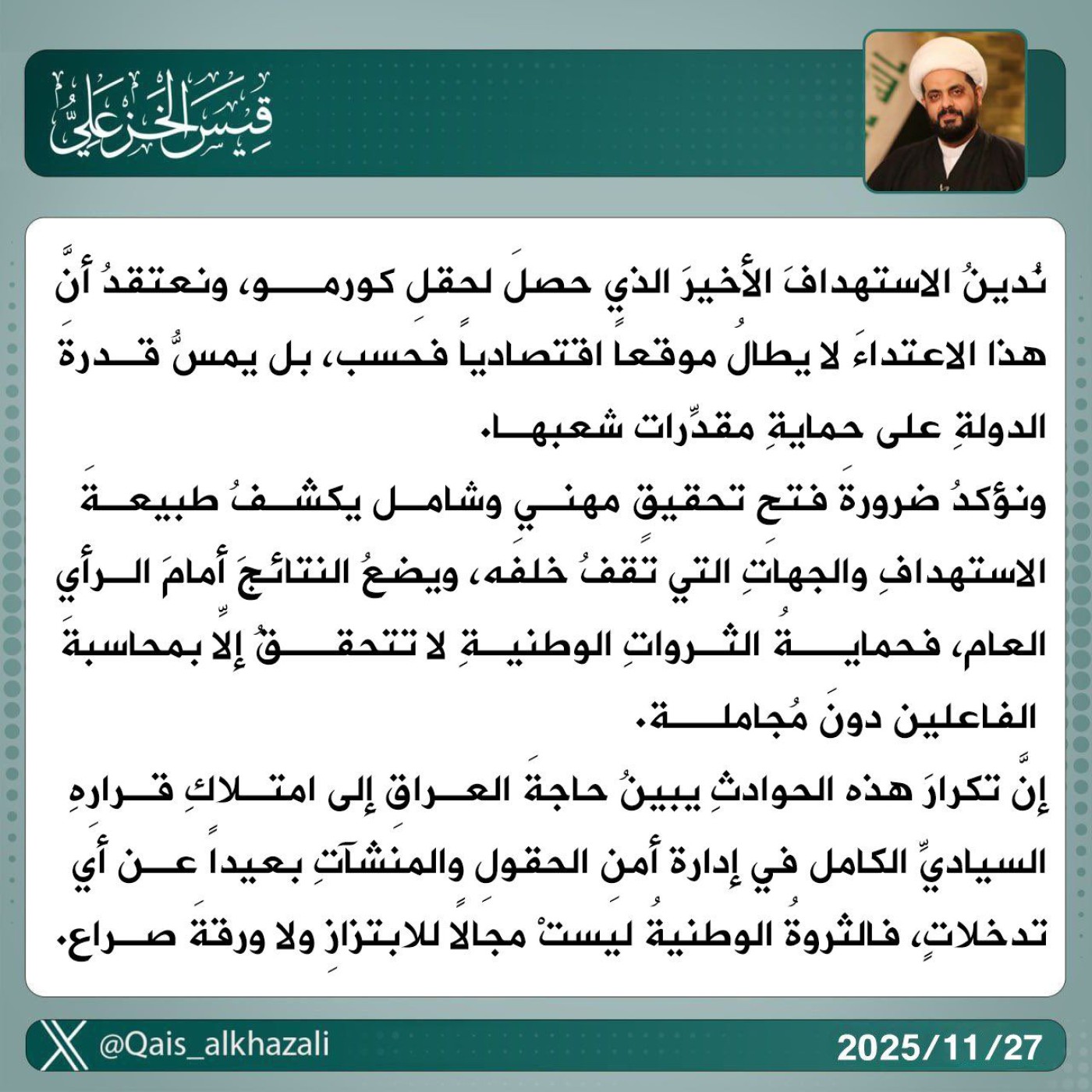 أدان الأمين العام لعصائب أهل الحق، قيس الخزعلي، استهداف حقل كورمور بطائرة مسيرة، مؤكداً على "ضرورة فتح تحقيق" يكشف طبيعة الاستهداف والجهات التي تقف خلفه.