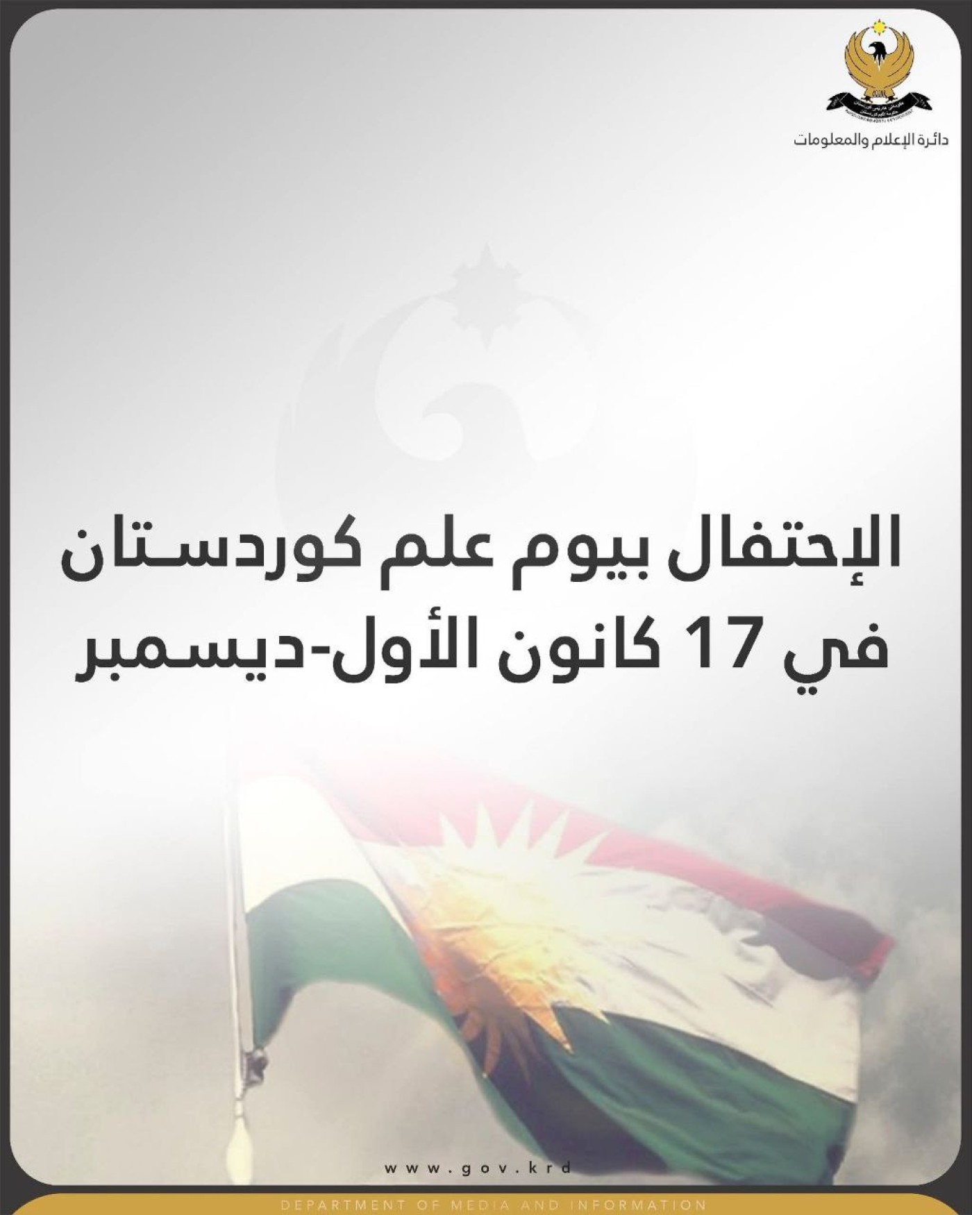 أعلنت حكومة إقليم كوردستان، الثلاثاء 2 كانون الأول 2025، إصدارها توجيهاً بالاحتفال بيوم العلم في 17 من الشهر الجاري.