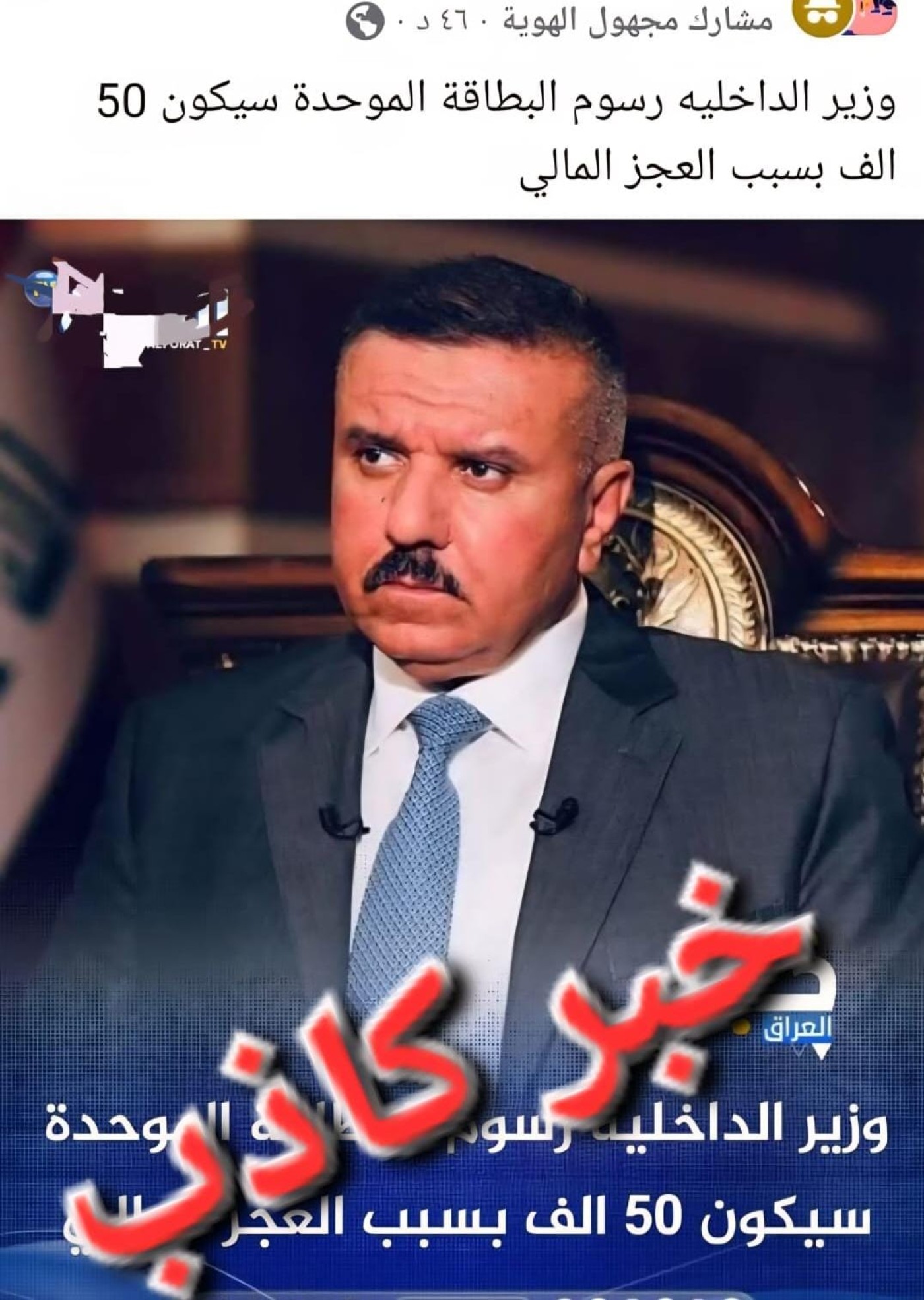 نفت وزارة الداخلية العراقية، الاثنين 8 كانون الأول 2025، صحّة الأنباء المتداولة، حول "رفع" رسوم البطاقة الوطنية إلى 50 ألف دينار.