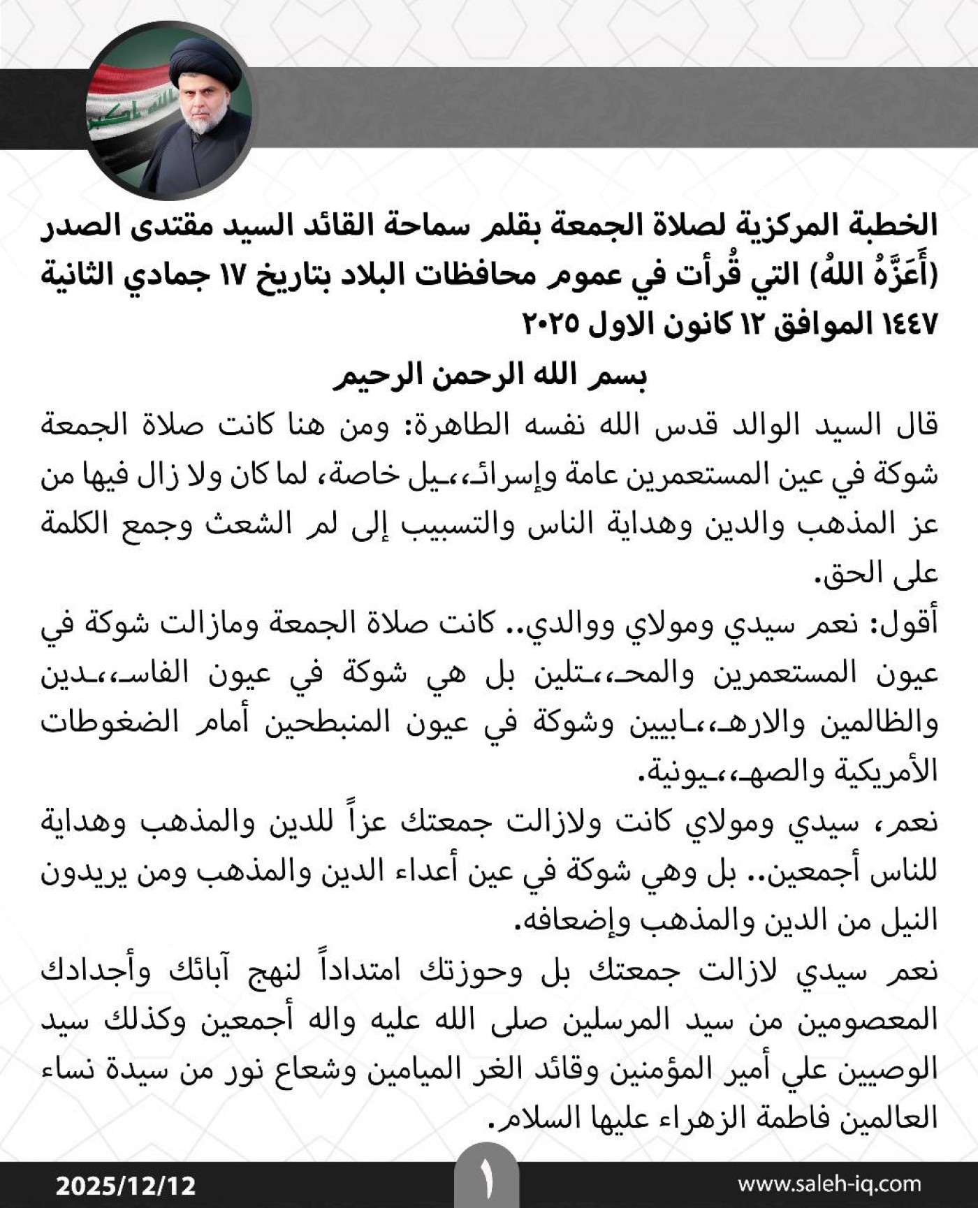 وقال الصدر في خطبة الجمعة المركزية التي جاءت بقلمه واطلعت عليها "الجبال"، "قد أضعف الفاسدون المذهب بفسادهم وسرقاتهم وانبطاحهم وعشقهم للسلطة فصار المذهب بخطر محدق من الداخل والخارج وبات التطبيع والديانة الإبراهيمية على الأبواب وبات المجاهد إرهابياً والإرهابي (صديقا) وبات الفساد سجية والظلم منهجاً. حتى ممن يدعون بك وبآل الصدر وصلاً.. وكلنا منهم براء إلى يوم الدين".