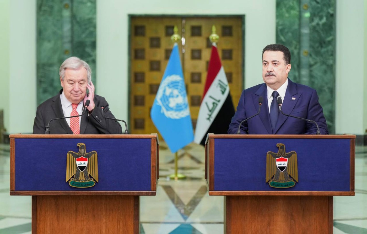 محمد شياع السوداني مع أنطونيو غوتيريش خلال مؤتمر صحفي مشترك في بغداد
