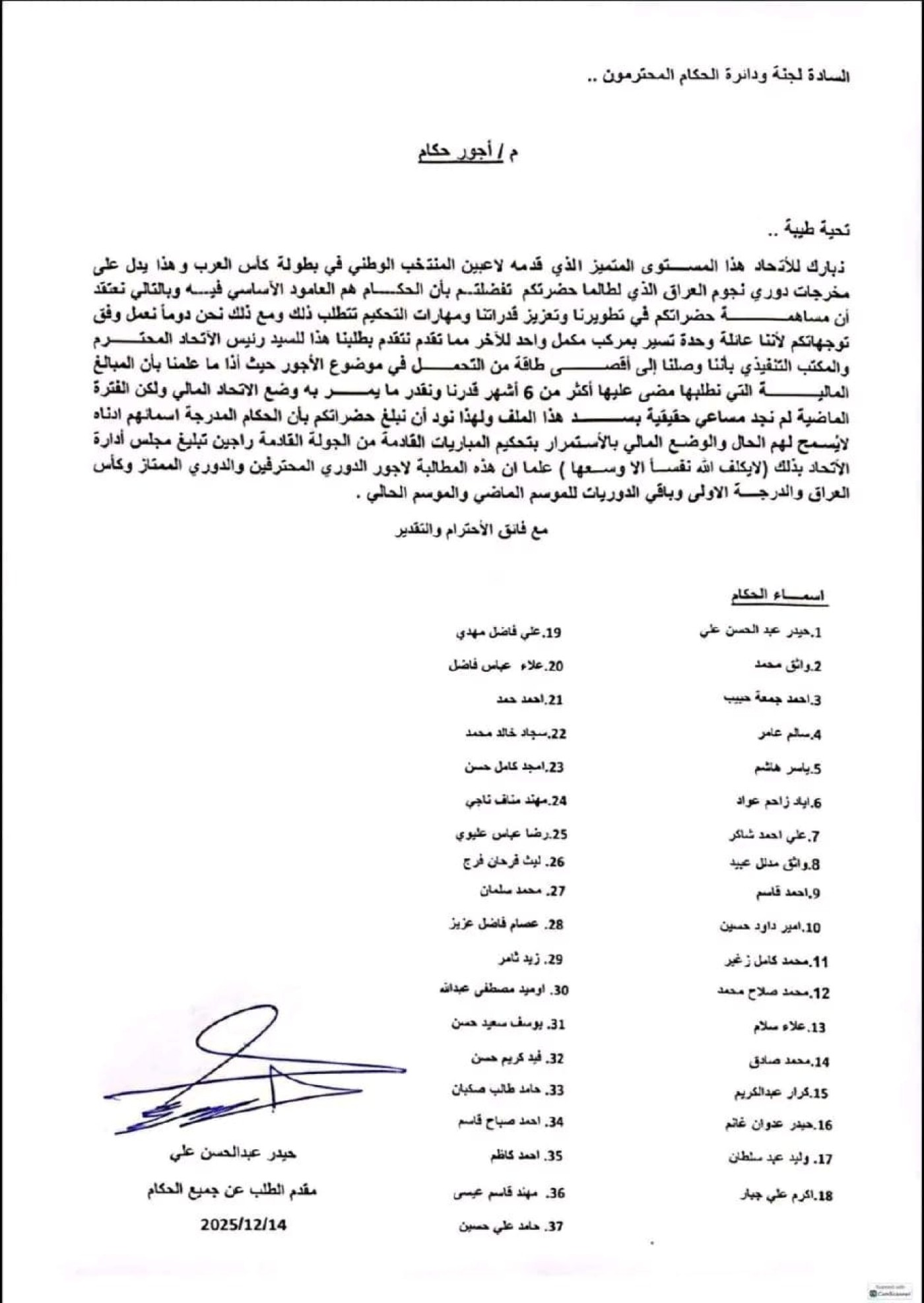 وأشار الحكّام في وثيقة اطلعت عليها "الجبال" إلى "عدم التحكيم في منافسات دوري نجوم العراق، ودوري الدرجة الممتازة، وبطولة الكأس، ودوري الدرجة الأولى، بسبب تاخر صرف مستحقاتهم المالية لمدة ستة أشهر".