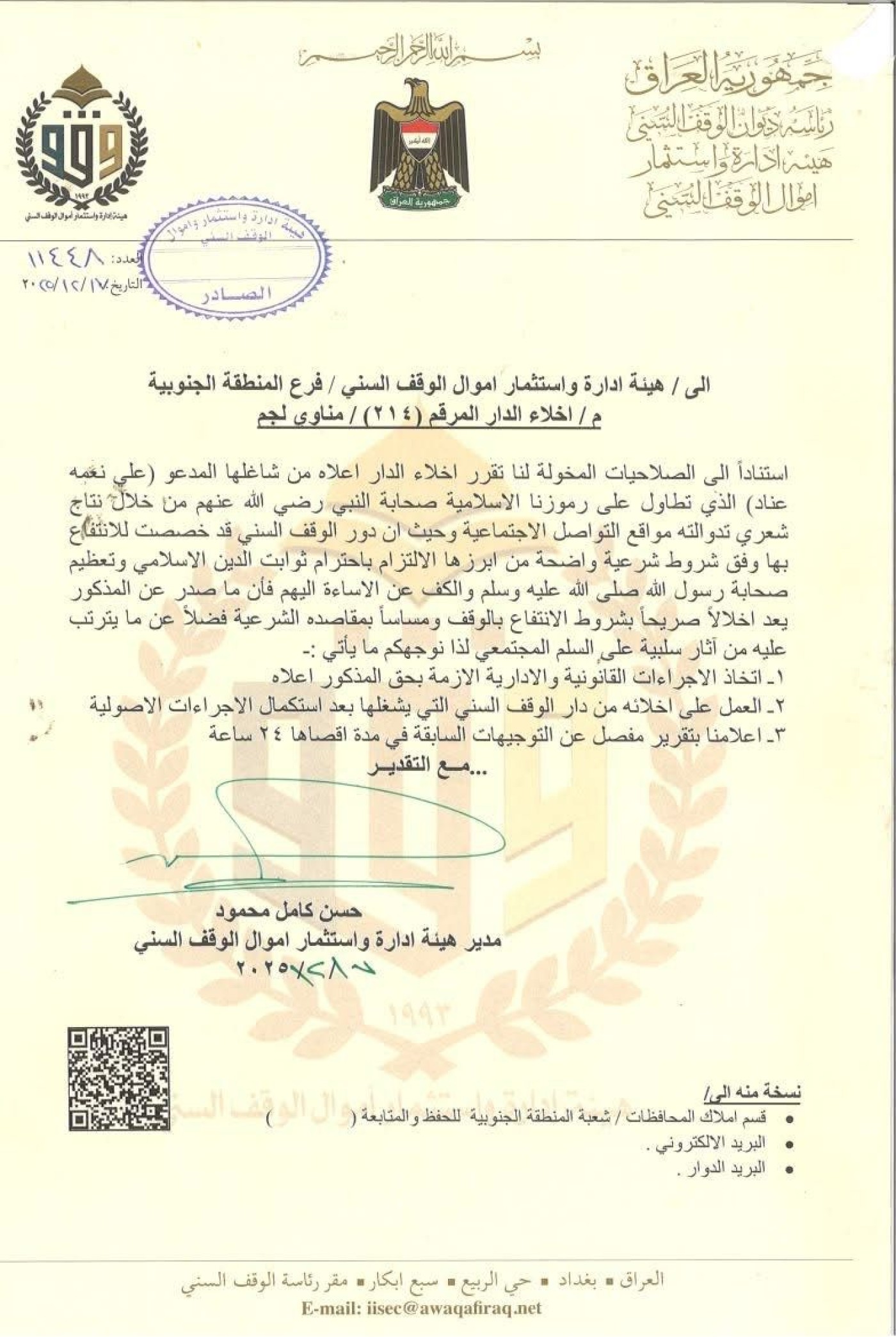 طالب ديوان الوقف السني بإخلاء الشاعر علي نعيم الدراجي من الدار المستأجرة له في محافظة البصرة، وذلك بسبب انتهاكه لشروط الانتفاع بالوقف.