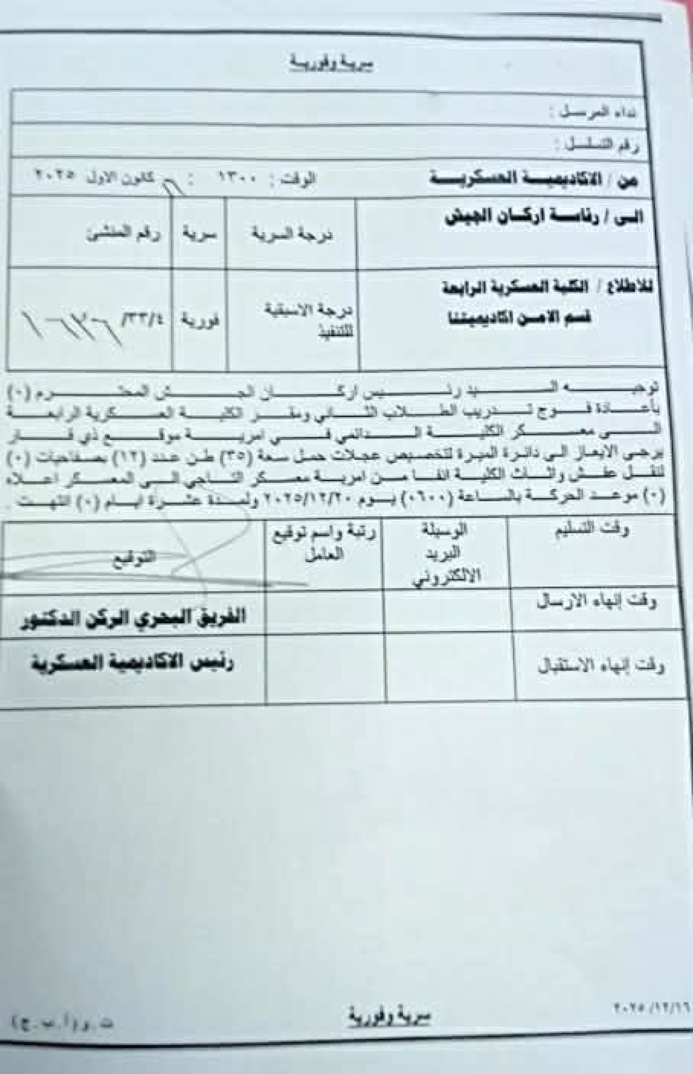 وفي السياق ذاته، أظهرت وثيقة صادرة عن الأكاديمية العسكرية حصلت "الجبال" على نسخة منها أن رئيس أركان الجيش وجّه بإعادة فوج تدريب الطلاب الثاني ومقر الكلية العسكرية الرابعة إلى معسكرها الدائمي في موقع ذي قار، فضلاً عن توجيه مديرية الميرة بتخصيص عجلات حمل لنقل الأثاث من معسكر التاجي إلى معسكر الكلية الدائمي.