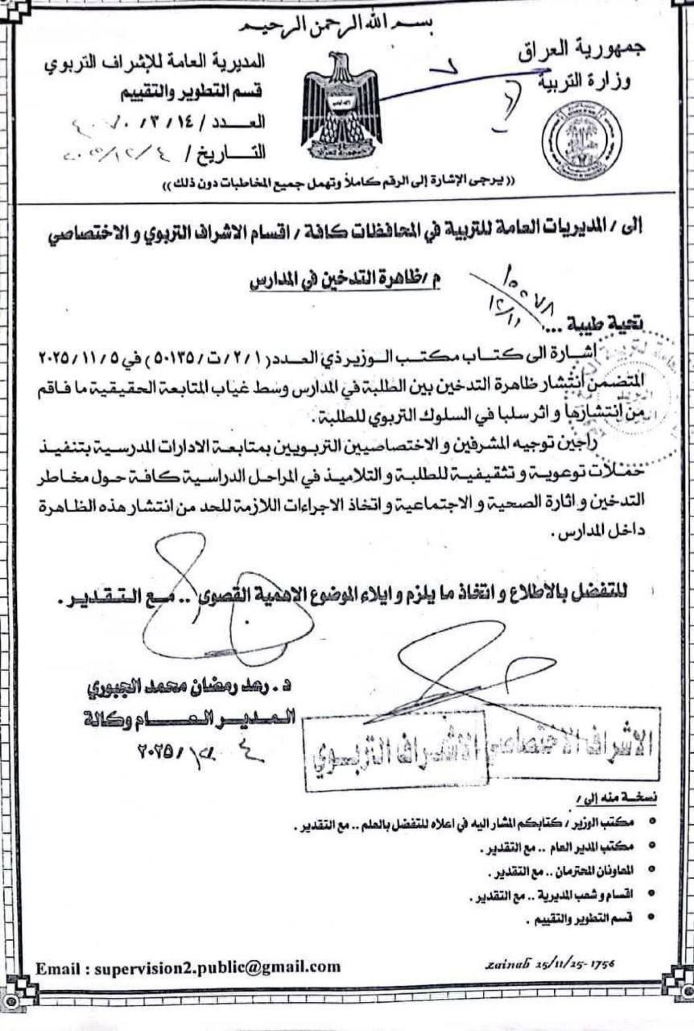 وجهت وزارة التربية العراقية بتنفيذ حملات توعوية للحد من انتشار ظاهرة التدخين داخل المدارس.