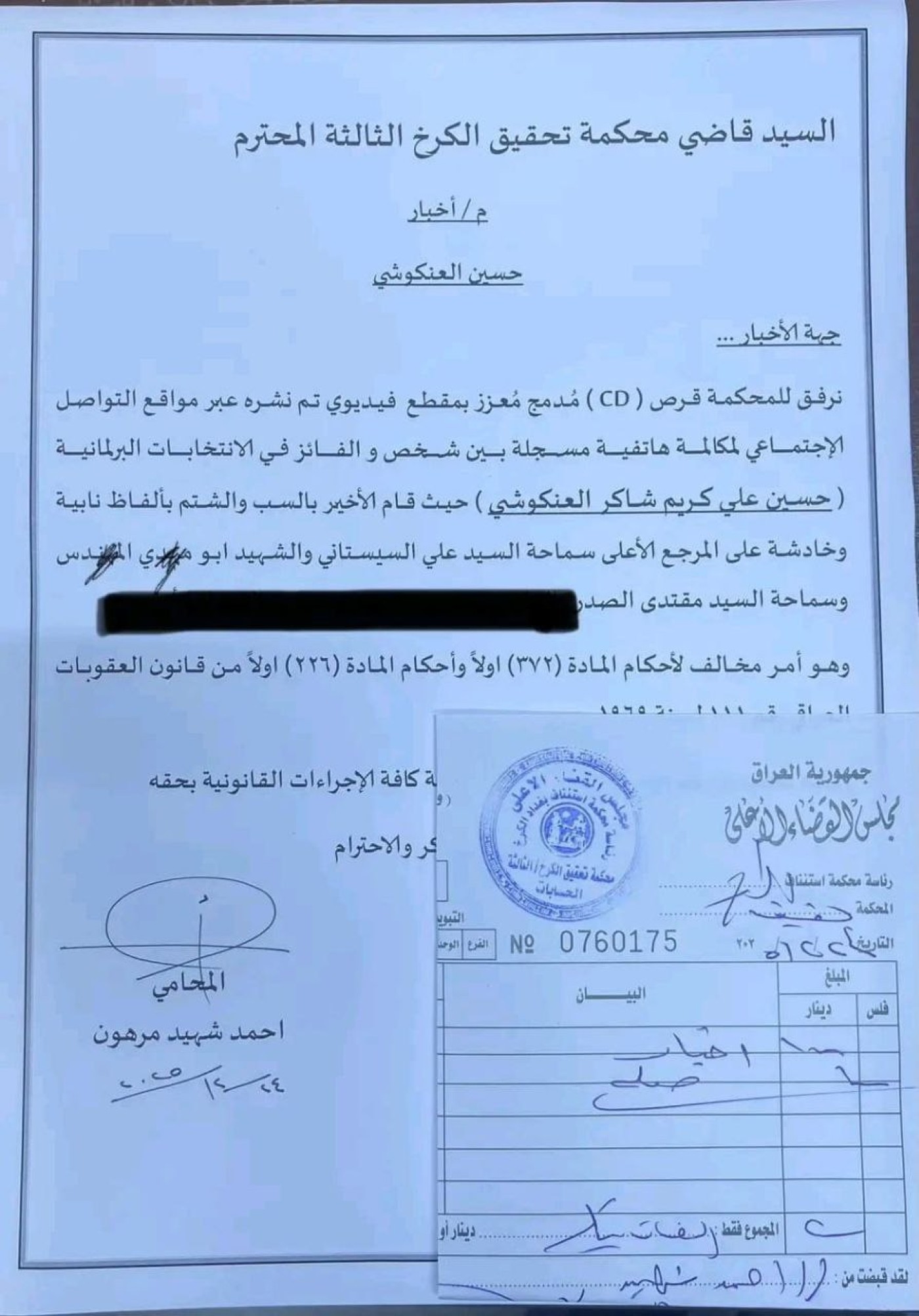 قدم النائب الفائز بالانتخابات، أحمد شهيد، إخباراً قضائياً بحق النائب الفائز عن ائتلاف الإعمار والتنمية، حسين العنكوشي بتهمة الإساءة إلى "الرموز الدينية والشهداء".