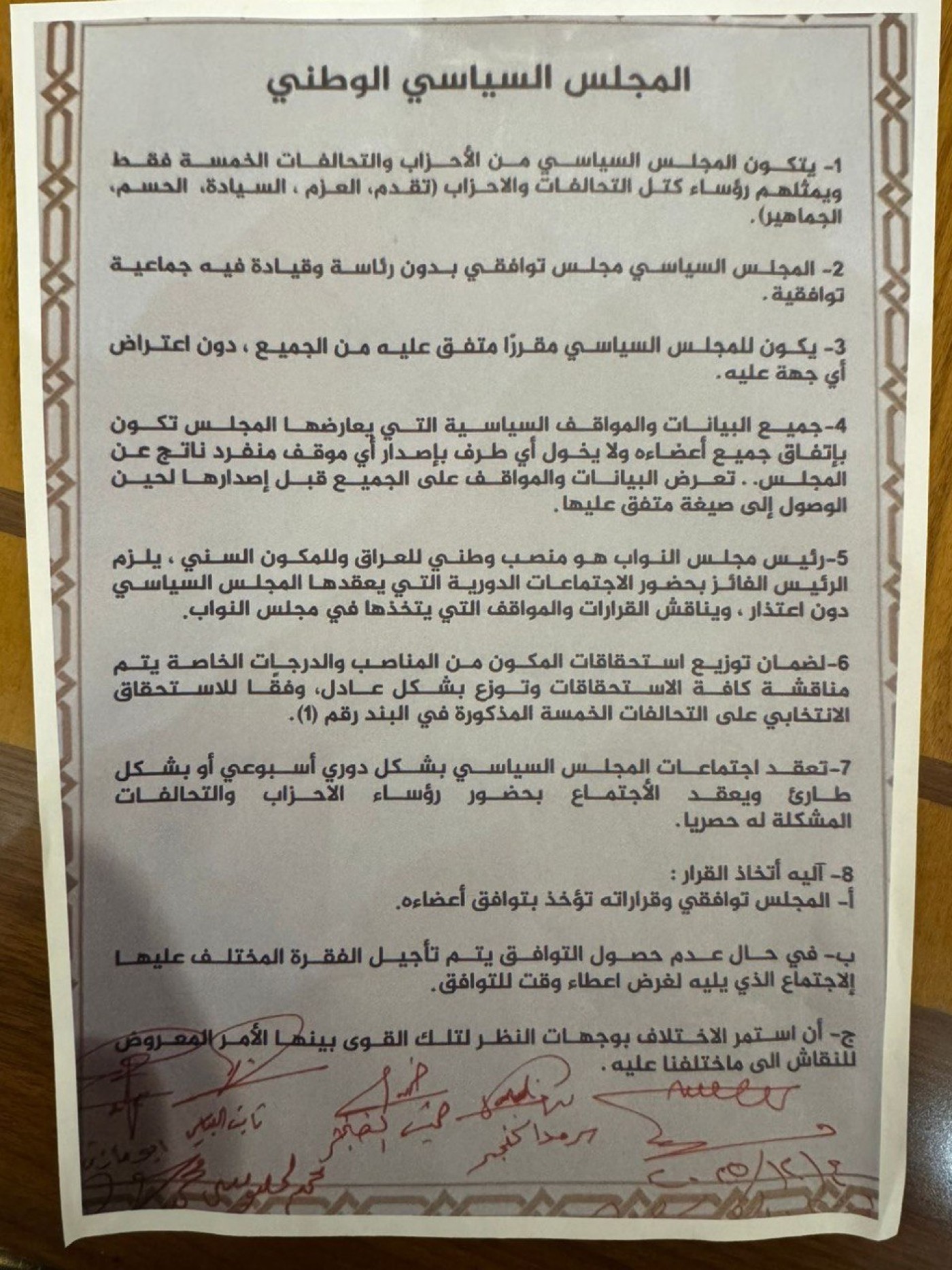 نص الاتفاق السياسي الموقّع بين أعضاء المجلس السياسي الوطني السني: