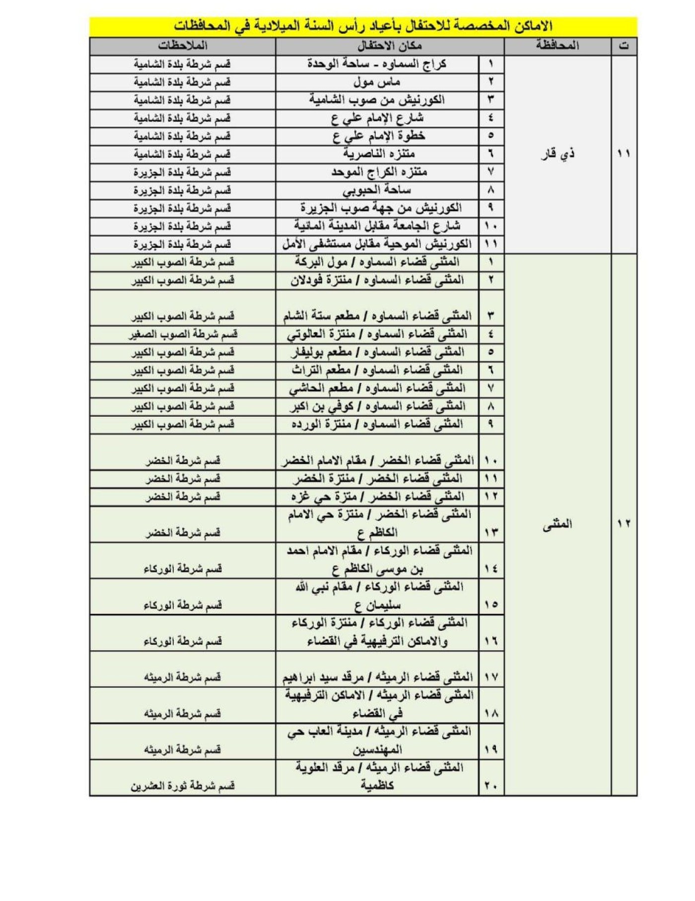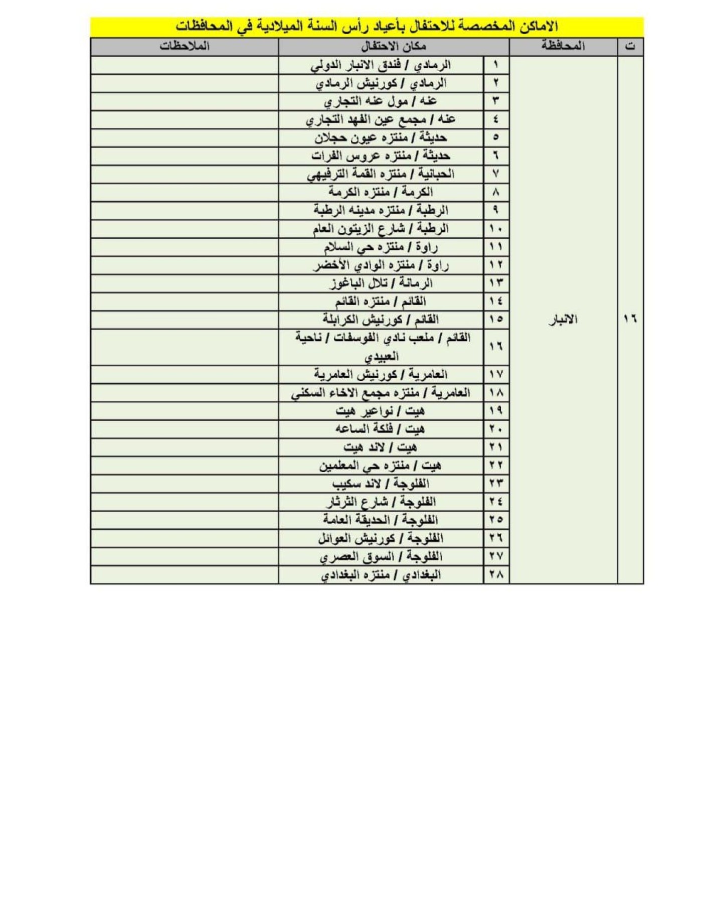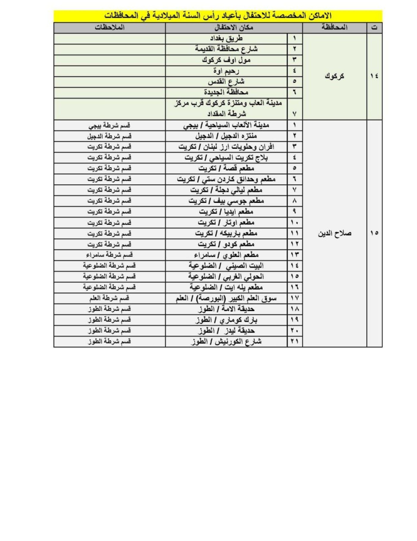 حدّدت وزارة الداخلية العراقية مواقع معيّنة للاحتفال بمناسبة رأس السنة، موجهة المواطنين للالتزام بالتعليمات مع اقتراب الحدث السنوي.