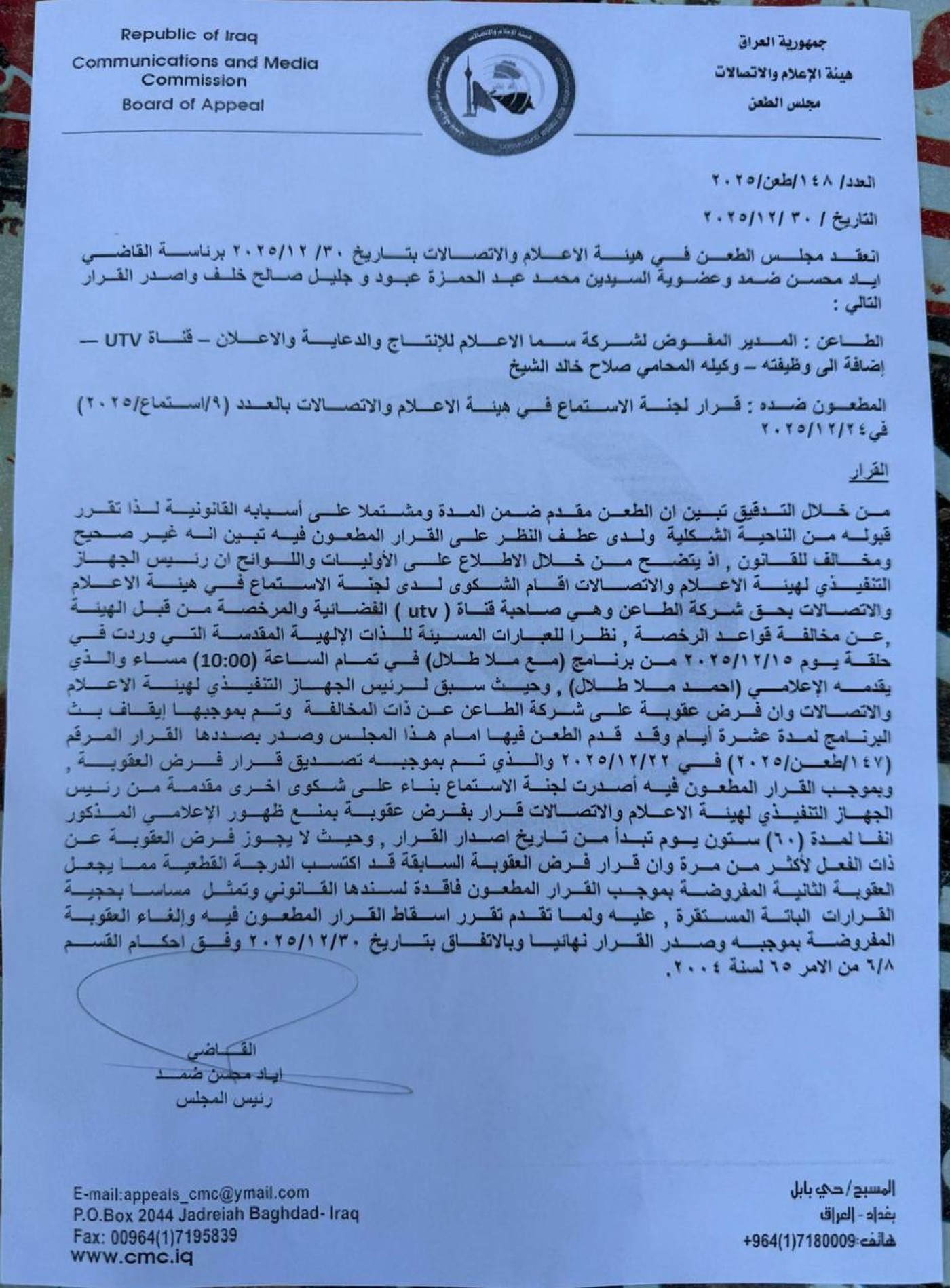 ووفقاً لوثيقة، صادرة عن الهيئة اطلعت عليها "الجبال"، فإن "القرار جاء بناءً على رصد مخالفات تضمنت الإساءة إلى الذات الإلهية"، في إشارة إلى حديثه حول أن "الحلبوسي ما يرجع لرئاسة البرلمان لو يجي الله"، وفق تعبيره.