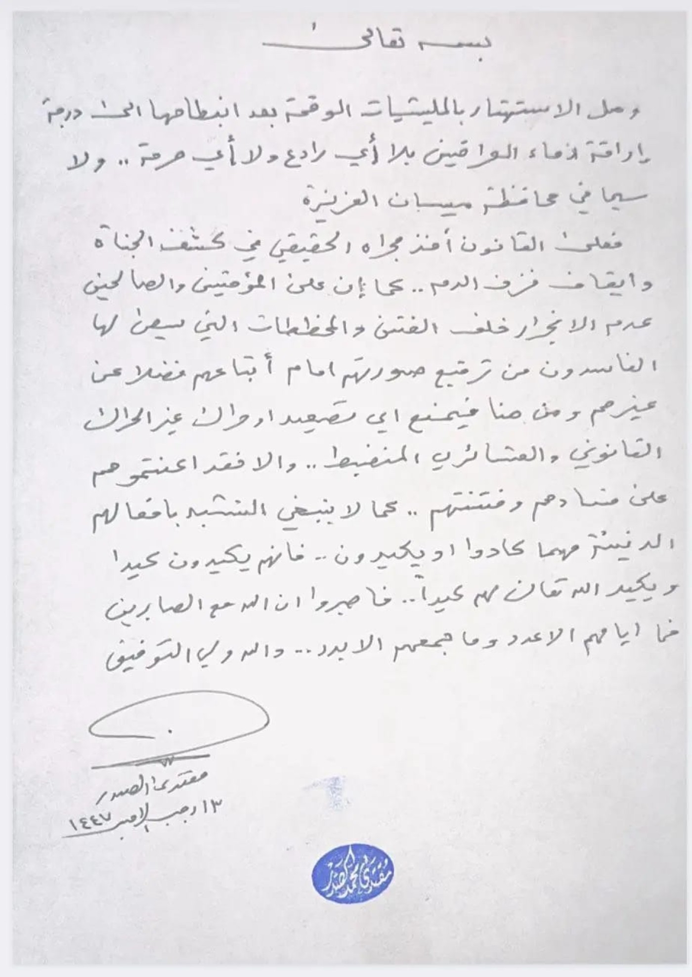 دعا الصدر أنصاره إلى التريّث، قائلاً: "فاصبروا إن الله مع الصابرين، فما إيامهم الا عدد وما جمعهم الا بدد .. والله ولي التوفيق".