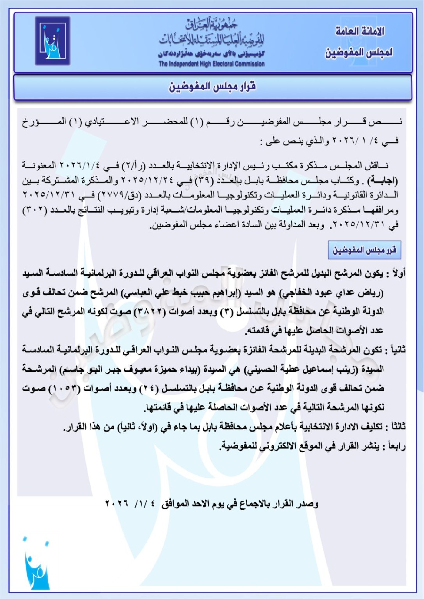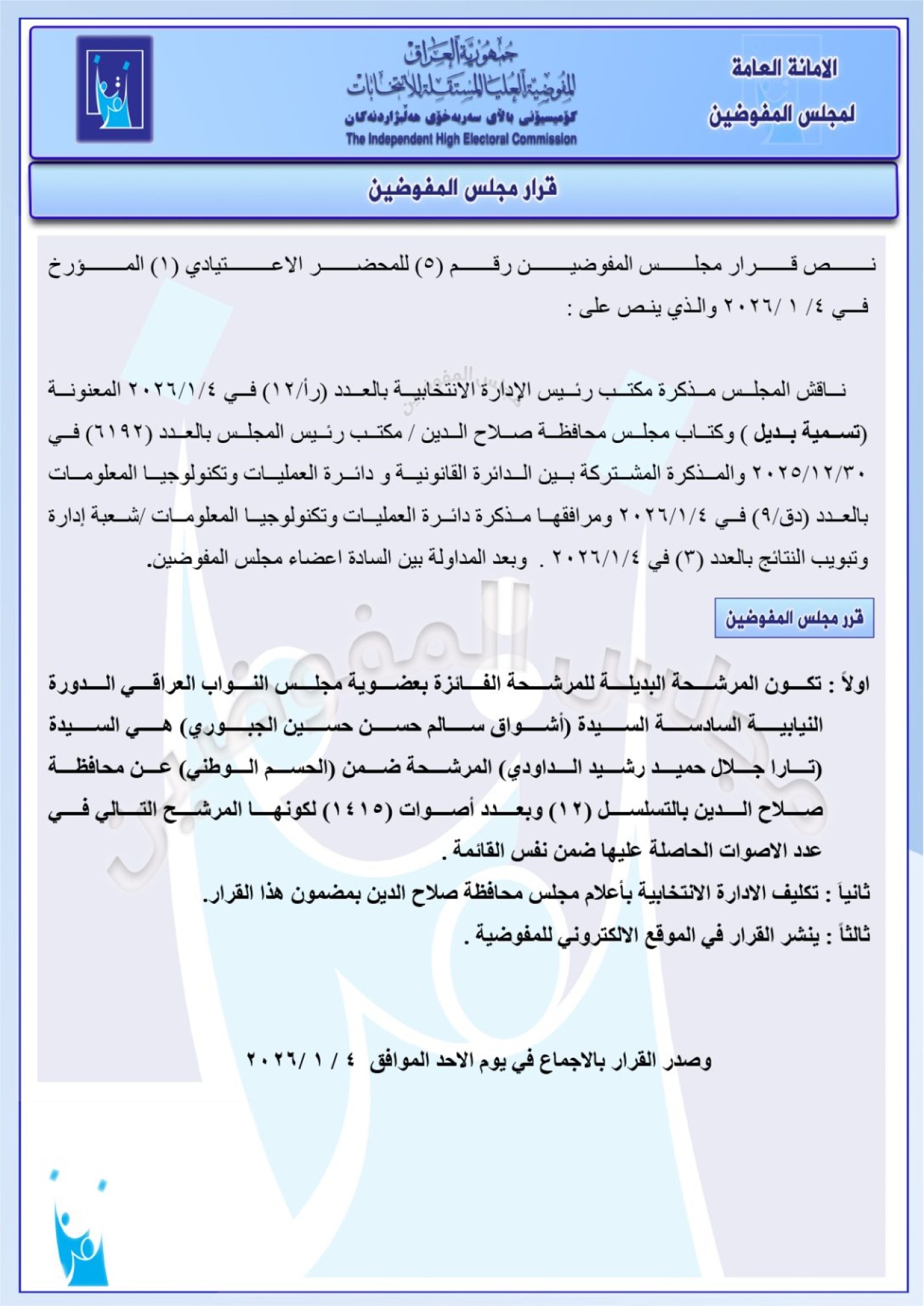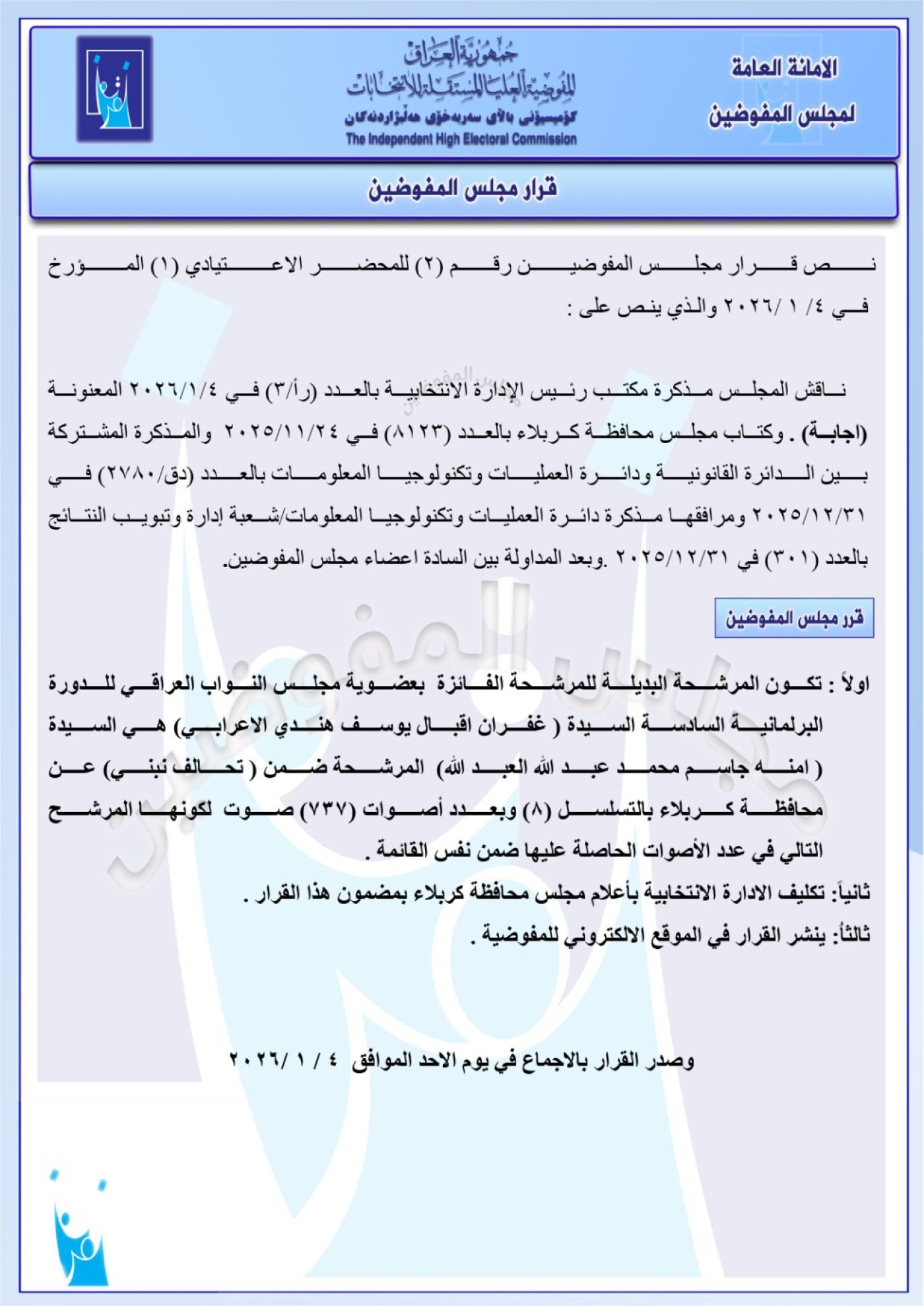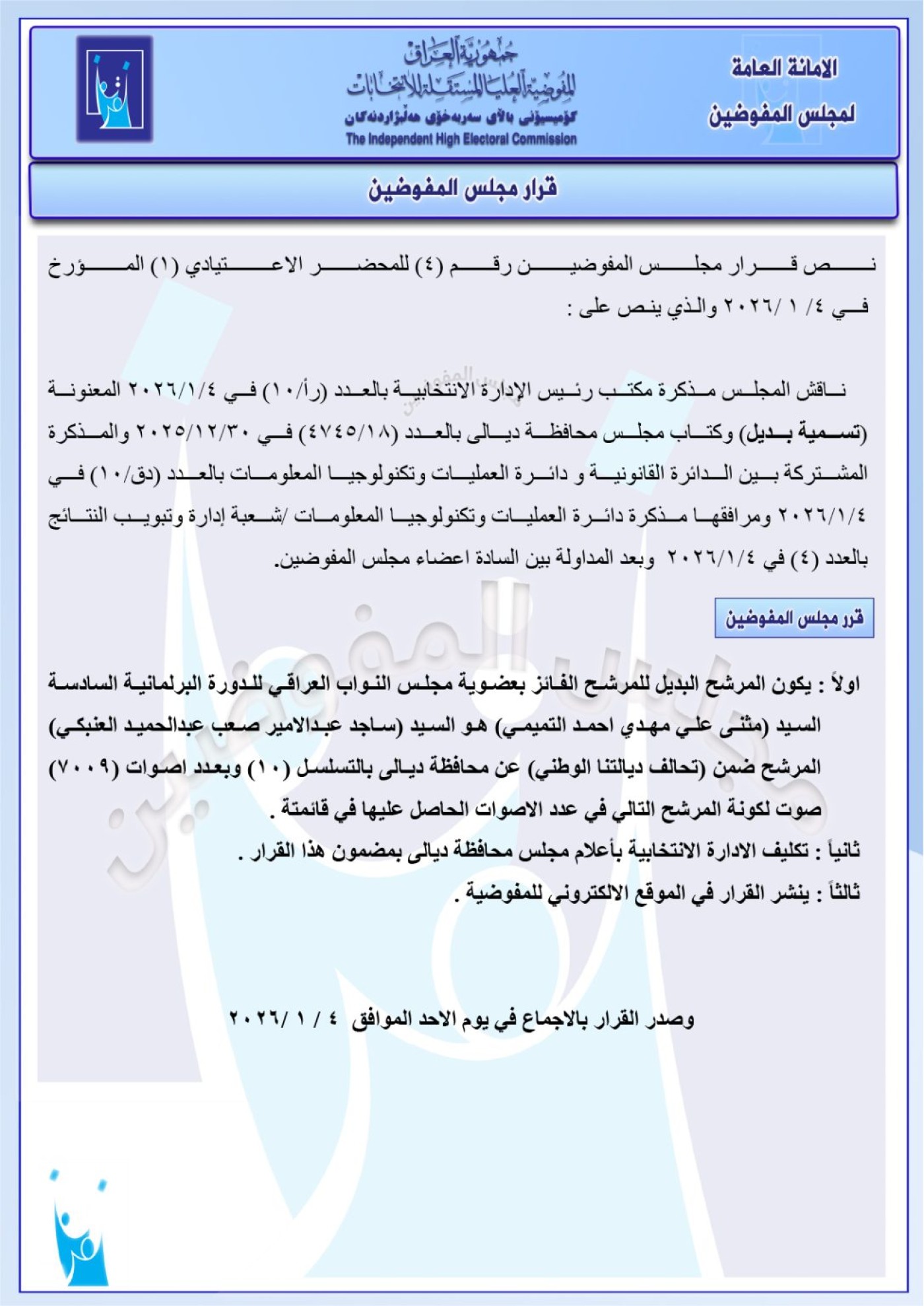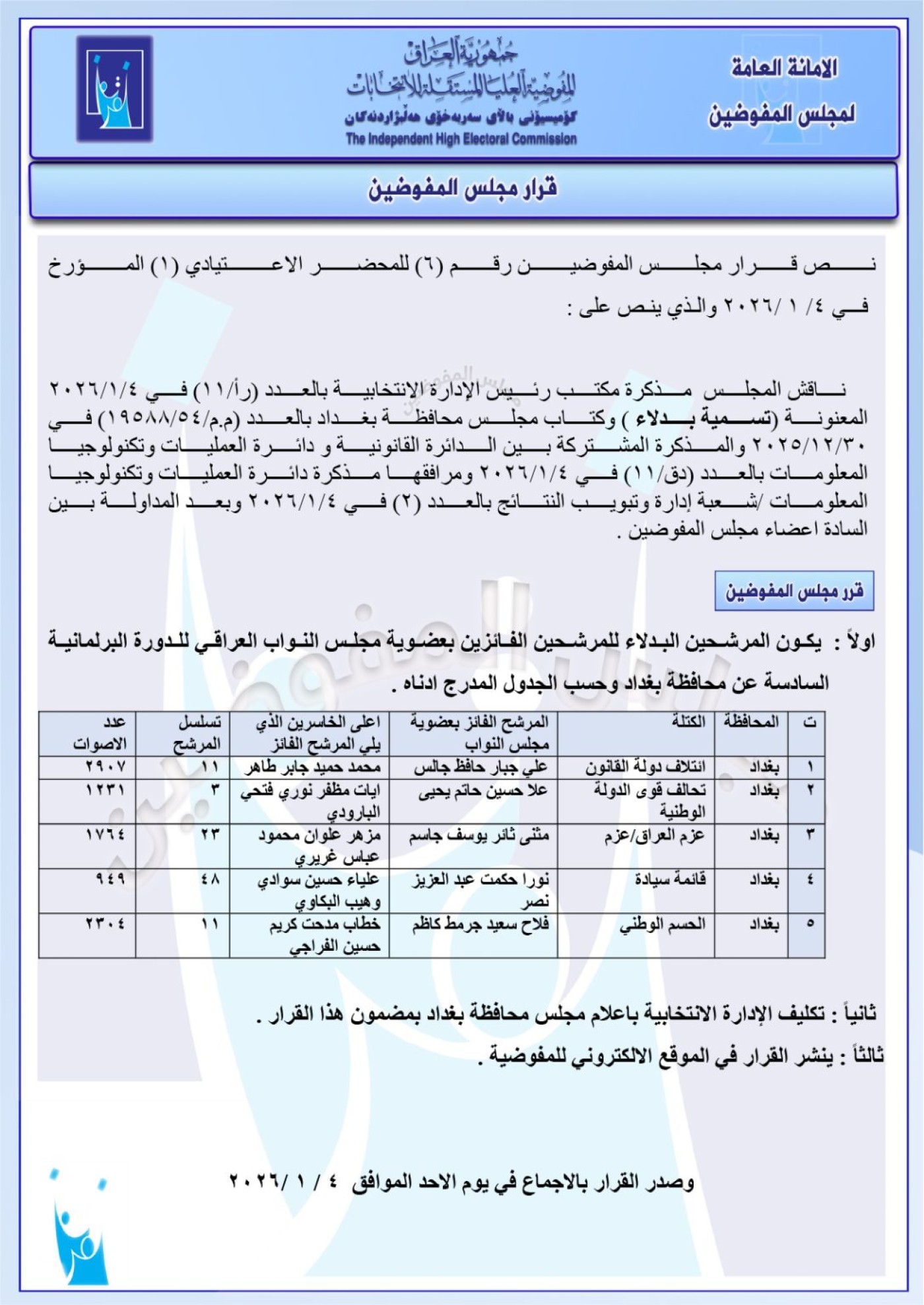 وأدرجت المفوضية، اليوم الاثنين 5 كانون الثاني 2026، أسماء 11 بديلاً لنواب في البرلمان العراقي عن محافظات مختلفة، استناداً على سلسلة قرارات صادرة عن مجلس المفوضين بهذا الخصوص.