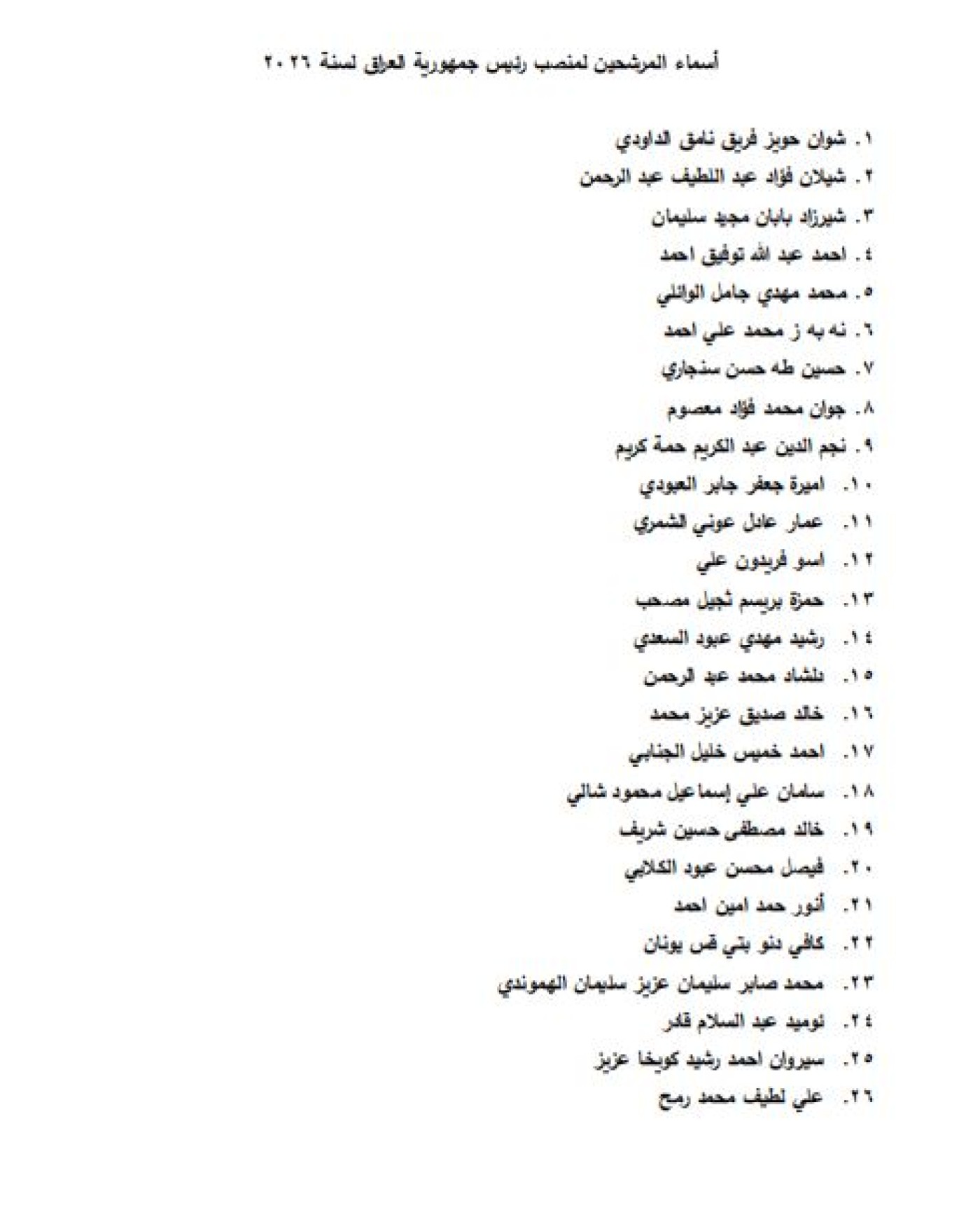 تنشر منصّة "الجبال"، 5 كانون الثاني 2026، أسماء المرشحين لمنصب رئيس جمهورية العراق، والبالغ عددهم 81 مرشّحاً.
