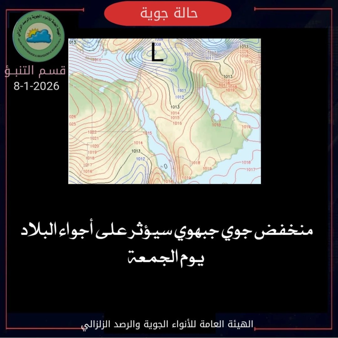 أكدت الهيئة العامة للأنواء الجوية العراقية، الخميس 8 كانون الثاني 2026، تأثر البلاد بمنخفض جبهوي بدءاً من يوم غد الجمعة، يتضمن هطول أمطار متفاوتة الشدّة، مع رياح مثيرة للغبار، وهطول ثلوج على المرتفعات الجبلية.