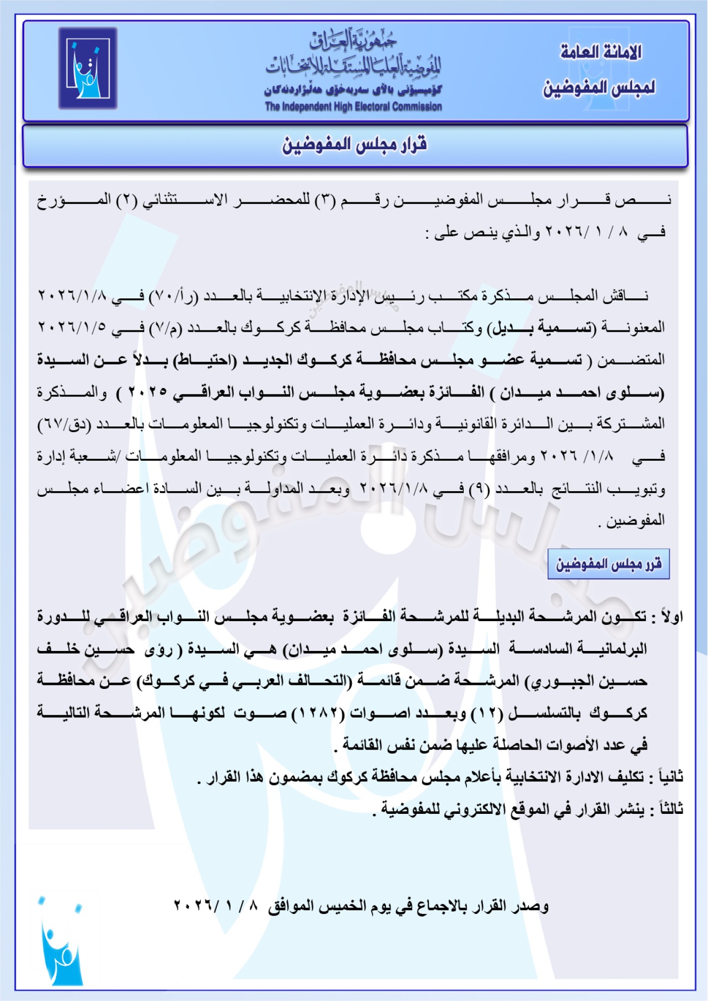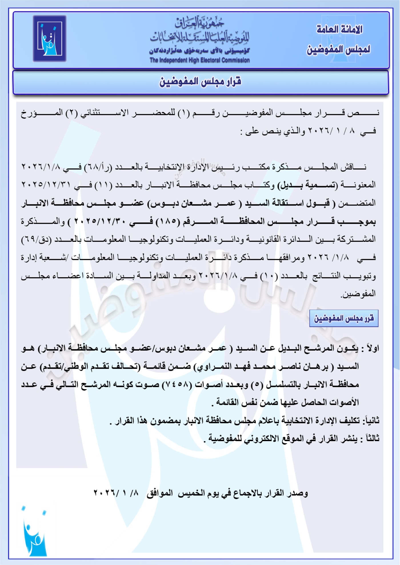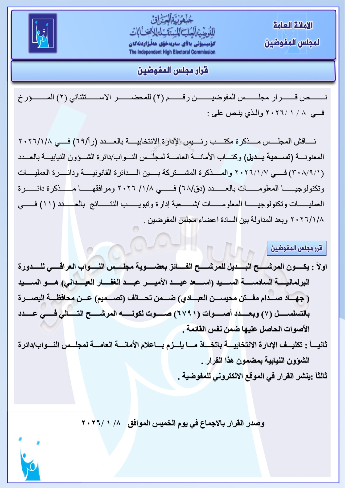 أعلنت مفوضية الانتخابات العراقية، الخميس 8 كانون الثاني 2026، أسماء نواب بدلاء عن مرشحين فائزين في الانتخابات، بينهم محافظا البصرة والأنبار.