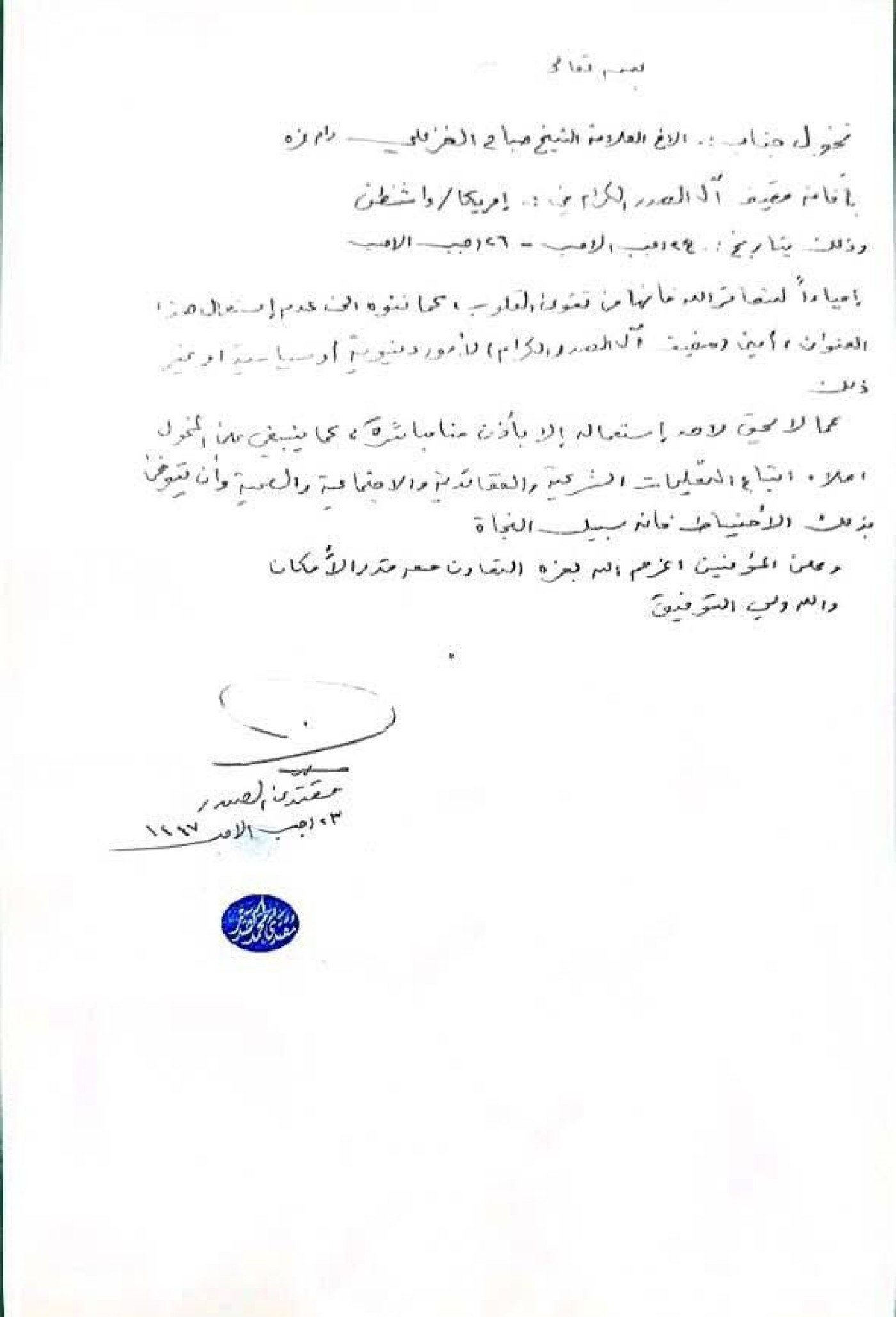 وجاء في رسالة كتبت بخط يد الصدر، ونشرت اليوم الخميس 15 كانون الثاني 2026، "نخوّل جناب الأخ العلامة الشيخ صباح الخزعلي بإقامة مضيف آل الصدر الكرام في أميركا/ واشنطن، وذلك بتاريخ 24 - 26 رجب 1447 الهجري، إحياء لشعائر الله".