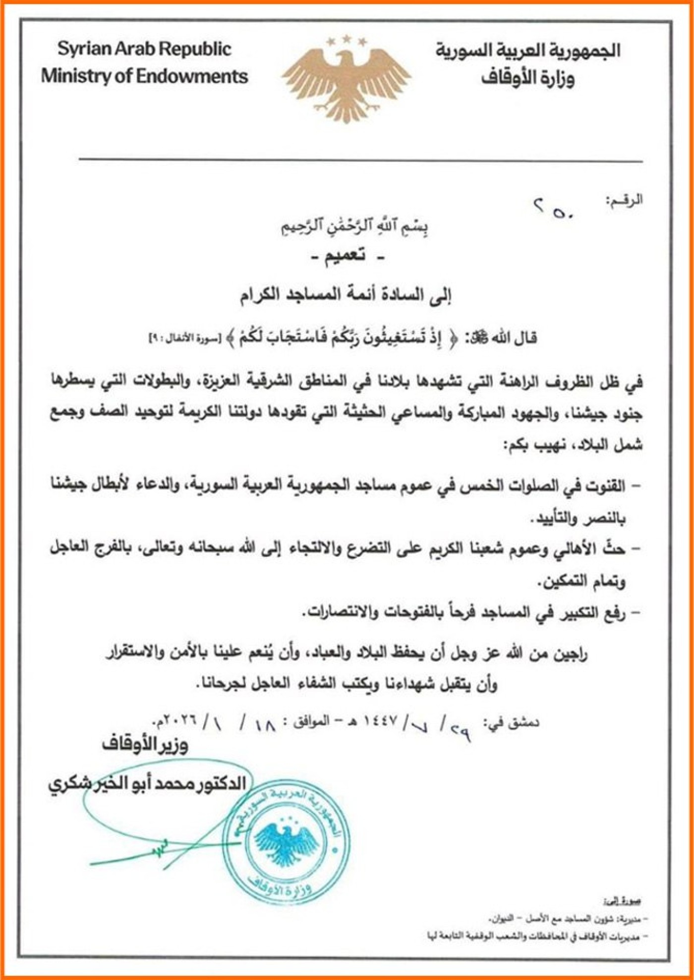 وجاء في توجيه عممته الأوقاف السورية على المساجد بتاريخ 18 كانون الثاني 2026، أنه "في ظل الظروف الراهنة التي تشهدها بلادنا في المناطق الشرقية العزيزة، والبطولات التي يسطرها جنود جيشنا، والجهود المباركة والمساعي الحثيثة التي تقودها دولتنا الكريمة لتوحيد الصف وجمع شمل البلاد، نهيب بكم: القنوت في الصلوات الخمس في عموم مساجد الجمهورية العربية السورية، والدعاء لأبطال جيشنا بالنصر والتأييد. وحثّ الأهالي وعموم شعبنا الكريم على التضرع والالتجاء إلى الله سبحانه وتعالى، بالفرج العاجل وتمام التمكين. كذلك رفع التكبير في المساجد فرحاً بالفتوحات والانتصارات".