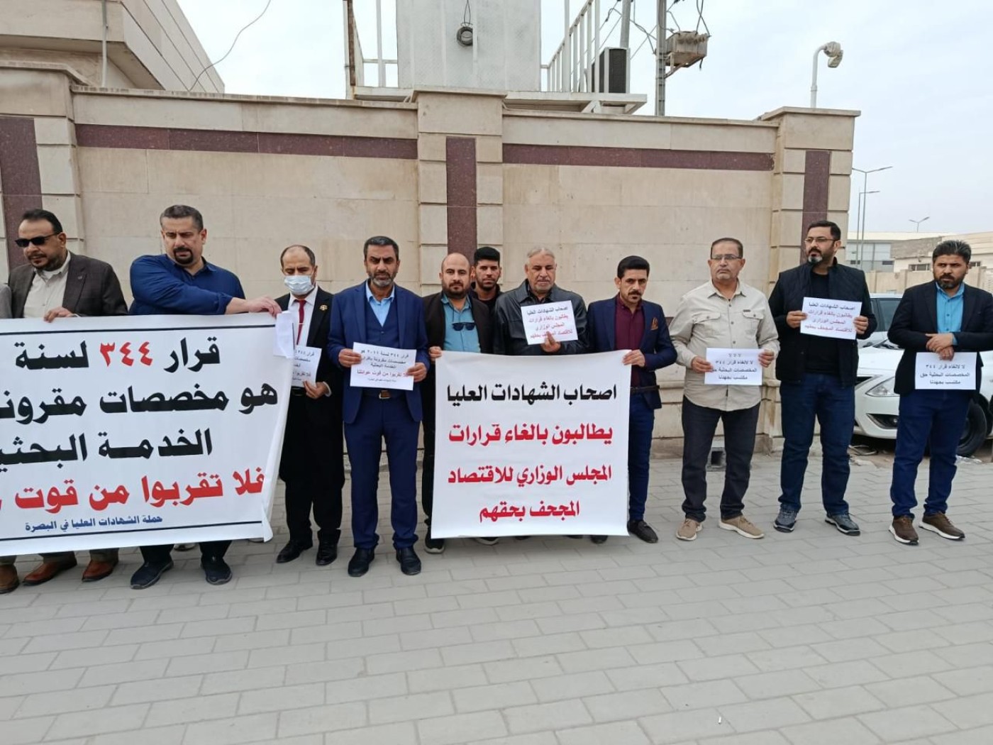تظاهر العشرات من أصحاب الشهادات العليا اليوم الثلاثاء أمام مجلس محافظة البصرة احتجاجاً على خطة تقليص النفقات التي أقرتها حكومة تصريف الأعمال برئاسة محمد شياع السوداني مؤخراً بناءً على توصيات مجلس الاقتصاد الوزاري والتي شملت إلغاء مخصصاتهم المالية المقررة دستورياً.