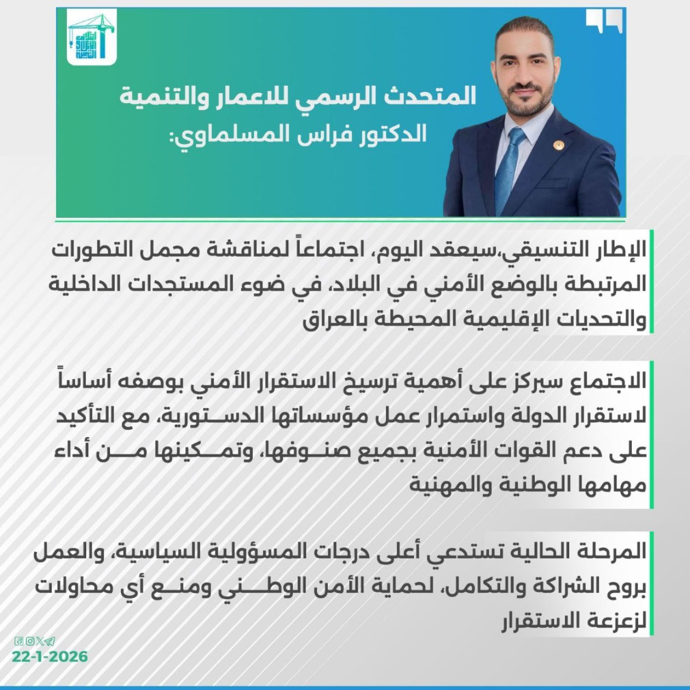 أعلن ائتلاف الإعمار والتنمية، برئاسة محمد شياع السوداني، أن الإطار التنسيقي سيعقد اجتماعاً اليوم الخميس لـ"بحث المستجدات الداخلية والتحديات الإقليمية المحيطة بالعراق".