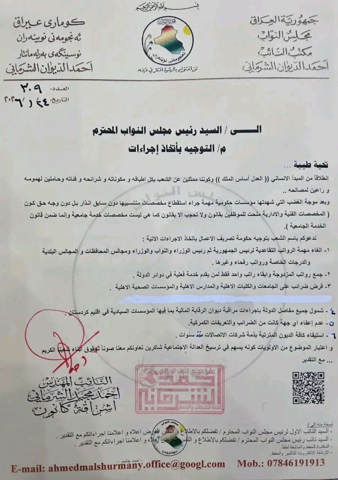 وطالب النائب أحمد الشرماني في كتاب موجّه إلى رئيس مجلس النواب العراقي هيبت الحلبوسي، بتاريخ 24 كانون الثاني 2026، بتوجيه الحكومة العراقية إلى اتخاذ ستة إجراءات تسهم في معالجة الأزمة المالية التي يعاني منها البلد، بينها "الغاء مهمة الرواتب التقاعدية لرئيس الجمهورية ورئيس الوزراء والنواب والوزراء ومجالس المحافظات والمجالس البلدية والدرجات الخاصة ورواتب رفحاء وغيرها"، و"شمول جميع مفاصل الدولة بإجراءات مراقبة ديوان الرقابة المالية بما فيها المؤسسات السيادية في إقليم كوردستان"، عاداً الخطوة "تسهم في ترسيخ العدالة الاجتماعية".