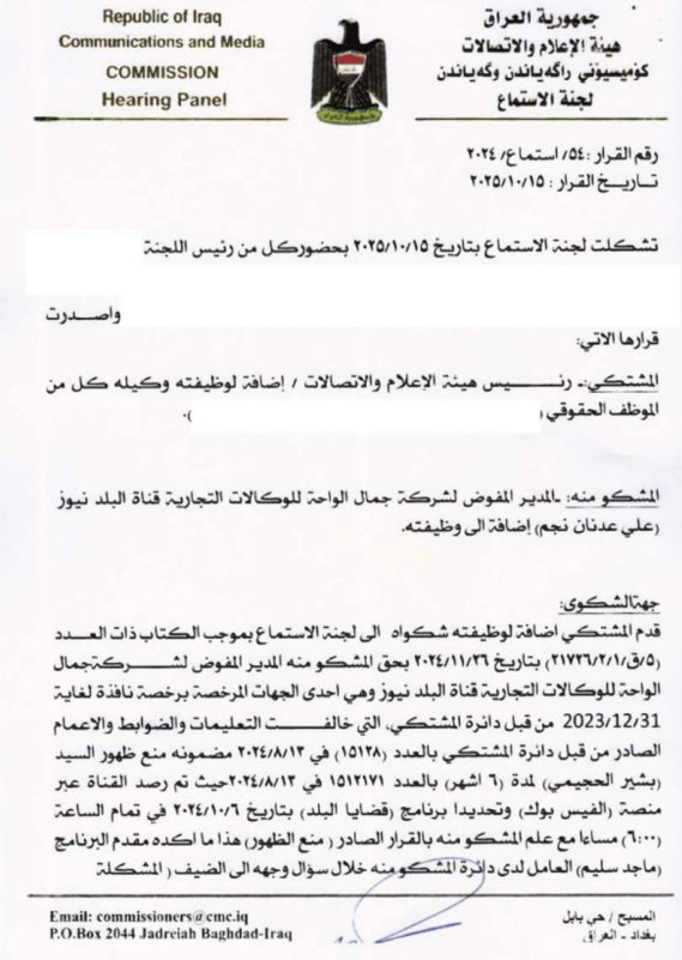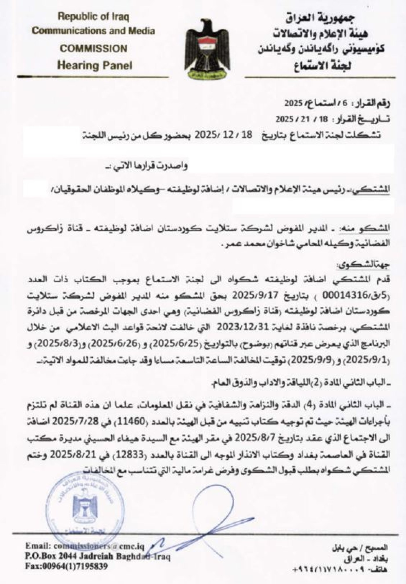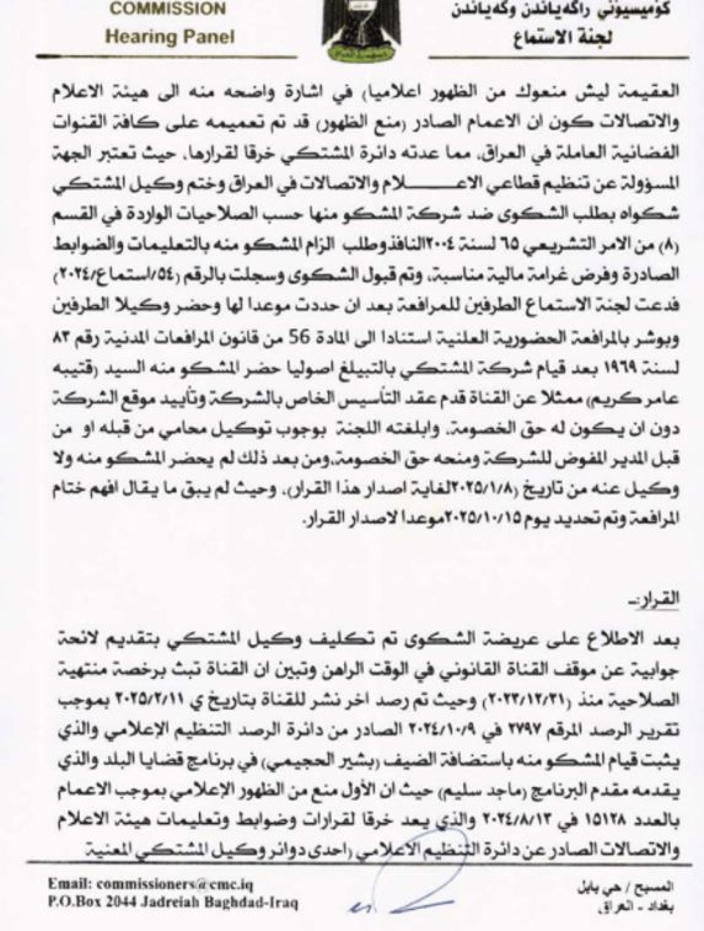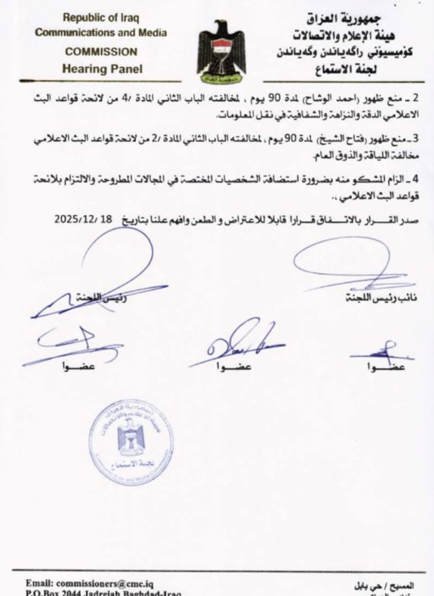 أصدرت هيئة الإعلام والاتصالات، الأحد 25 كانون الثاني 2026، قراراً بمنع كل من الناشط “أحمد الوشاح” والسياسي “فتاح الشيخ”، من الظهور الإعلامي لمدة 90 يوماً، بسبب "مخالفة قواعد اللياقة والذوق العام في لوائح البث الإعلامي"، بينما أصدرت قراراً آخر، يقضي بوقف برنامج “قضايا البلد” من البث لمدة 3 أشهر، فضلاً عن منع الظهور الإعلامي لمقدم البرنامج “ماجد سليم” للمدة ذاتها، وفرض غرامة مالية بحق القناة بقيمة 40 مليون دينار.