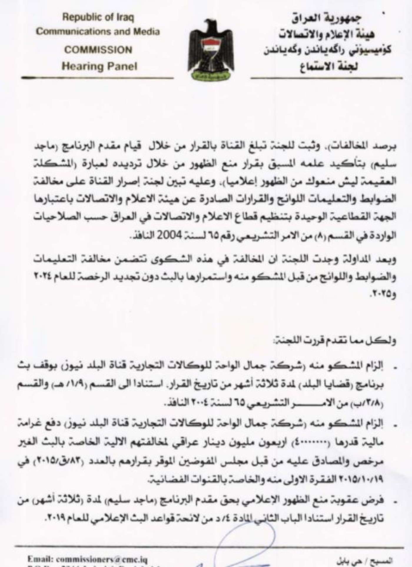 كما أظهرت وثائق أخرى صادرة عن الهيئة، منع الظهور الإعلامي، للإعلامي "ماجد سليم" وإيقاف برنامجه لمدة 90 يوماً، بالإضافة إلى غرامة مالية بحق القناة بقيمة 40 مليون دينار، على خلفية استضافة "بشير الحجيمي" الممنوع من الظهور الإعلامي.