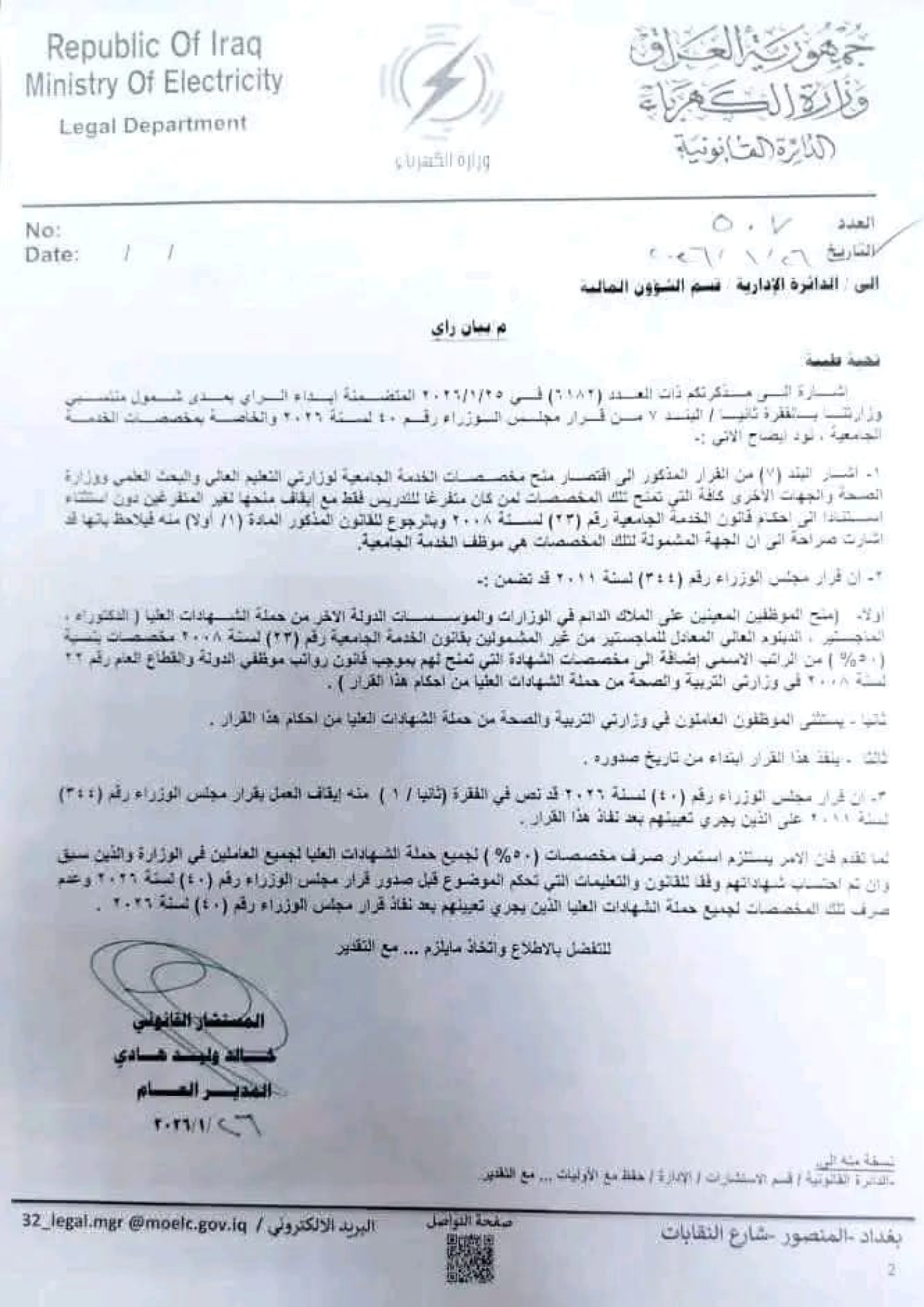 وأوضحت الدائرة القانونية بوزارة الكهرباء، في كتاب رسمي موجّه إلى الدائرة الإدارية/ قسم الشؤون المالية، بتاريخ 26 كانون الثاني 2026، وتم نشره اليوم السبت الموافق 31 كانون الثاني 2026، وفق القانون، استمرار صرف مخصصات الـ50٪ لجميع الموظفين الحاليين من حملة الشهادات العليا بالوزارة، فيما يشمل الإيقاف فقط التعيينات الجديدة وفق قانون 344 لسنة 2011.